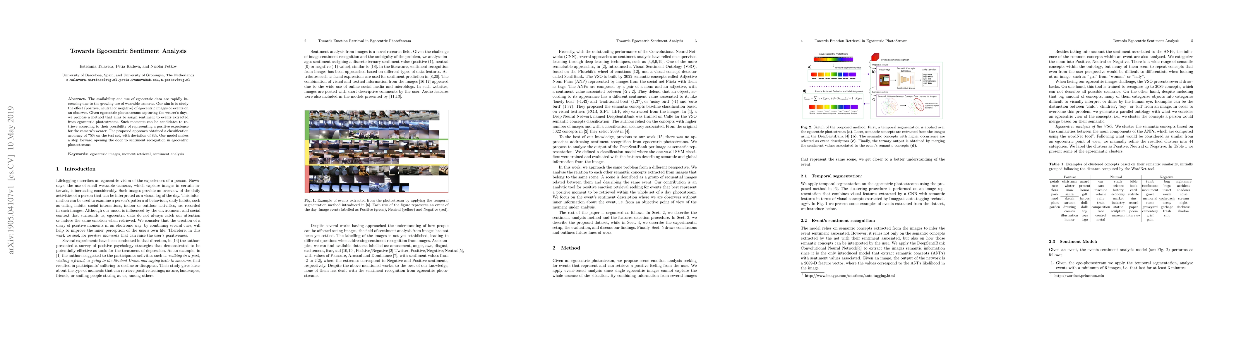 This paper proposes a method for assigning sentiment to events in egocentric photostreams captured by wearable cameras, aiming to retrieve moments that likely represent positive experiences for the wearer. The model achieves a classification accuracy of 75% with an 8% deviation, advancing the field of sentiment recognition in egocentric data.
