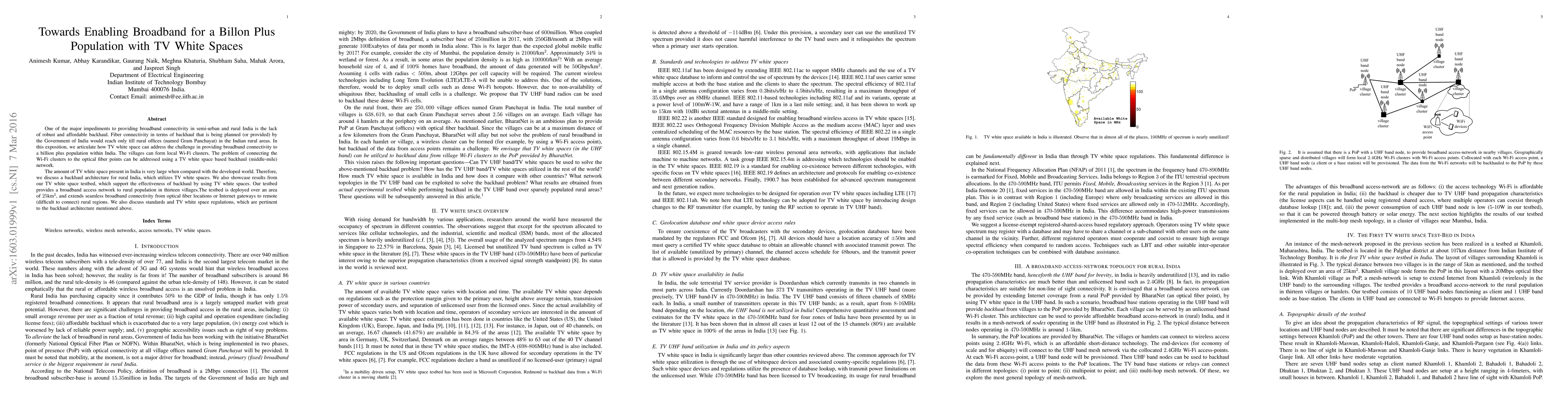 This paper explores using TV white spaces to provide broadband connectivity in rural India, addressing the lack of affordable backhaul infrastructure. The proposed TV white space-based backhaul network enables local Wi-Fi clusters and seamless connectivity to rural regions, supported by testbed results in thirteen villages.