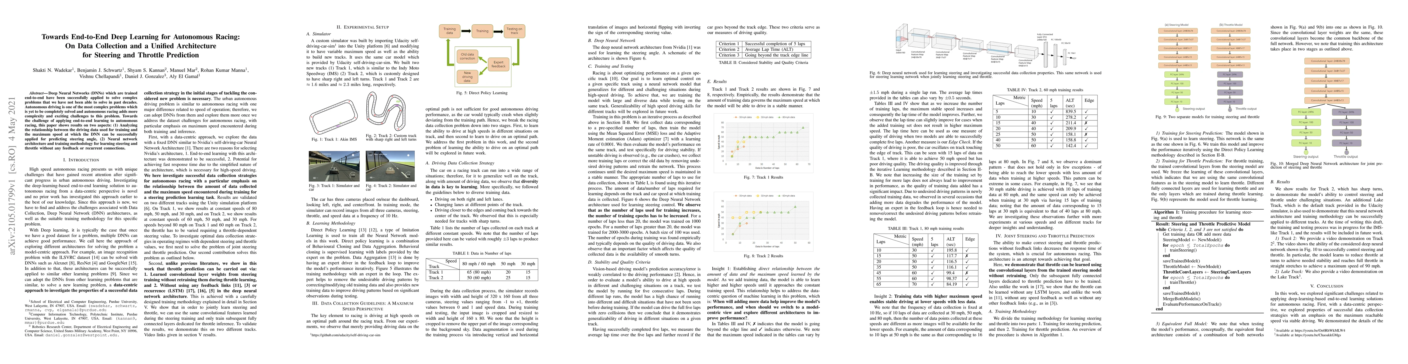 This paper explores end-to-end deep learning for autonomous racing, focusing on data collection and a unified architecture for predicting steering and throttle. It investigates the impact of training data on performance and proposes a non-recurrent neural network for effective steering and throttle prediction.