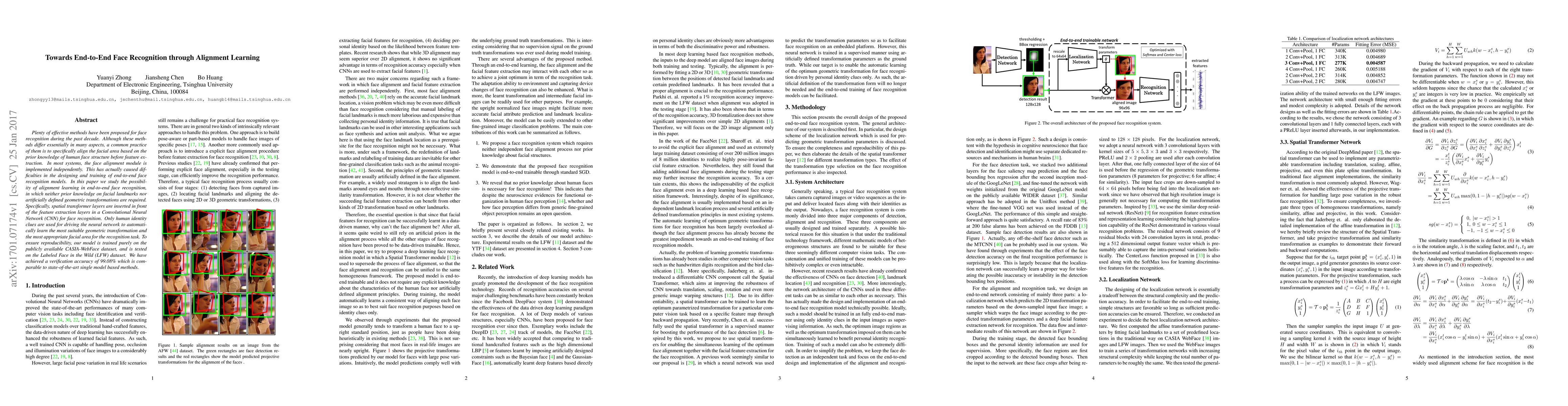This paper explores end-to-end face recognition through alignment learning without prior facial landmark knowledge, using spatial transformer layers in a CNN to automatically determine optimal geometric transformations. Achieved 99.08% verification accuracy on LFW, comparable to state-of-the-art methods.