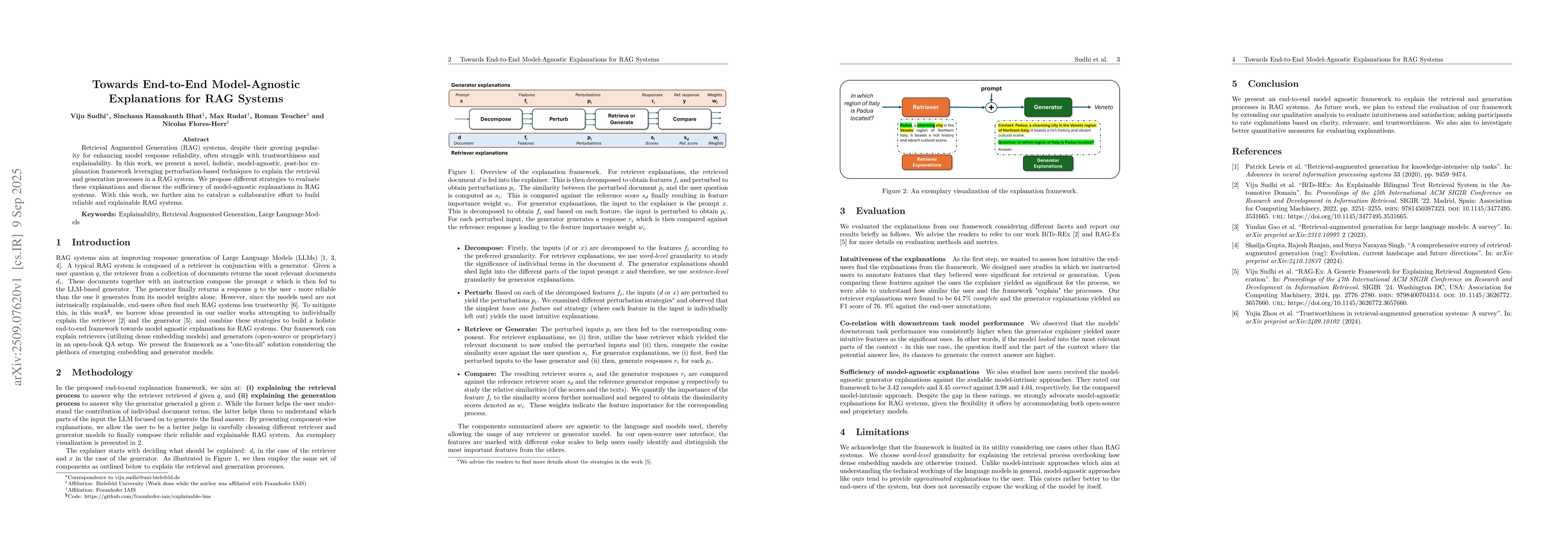 Retrieval Augmented Generation (RAG) systems, despite their growing popularity for enhancing model response reliability, often struggle with trustworthiness and explainability. In this work, we present a novel, holistic, model-agnostic, post-hoc explanation framework leveraging perturbation-based techniques to explain the retrieval and generation processes in a RAG system. We propose different strategies to evaluate these explanations and discuss the sufficiency of model-agnostic explanations in RAG systems. With this work, we further aim to catalyze a collaborative effort to build reliable and explainable RAG systems.