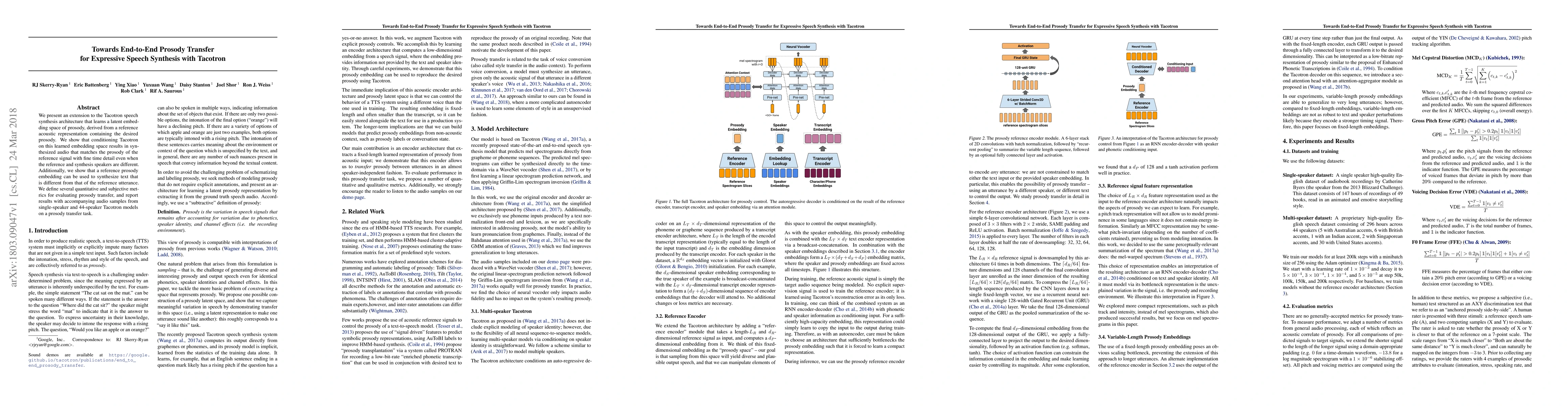This paper extends Tacotron to enable end-to-end prosody transfer, learning a latent embedding space from reference prosody to synthesize speech matching the prosody of the reference signal, even across different speakers. Evaluation metrics and results demonstrate successful prosody transfer in both single-speaker and multi-speaker models.
