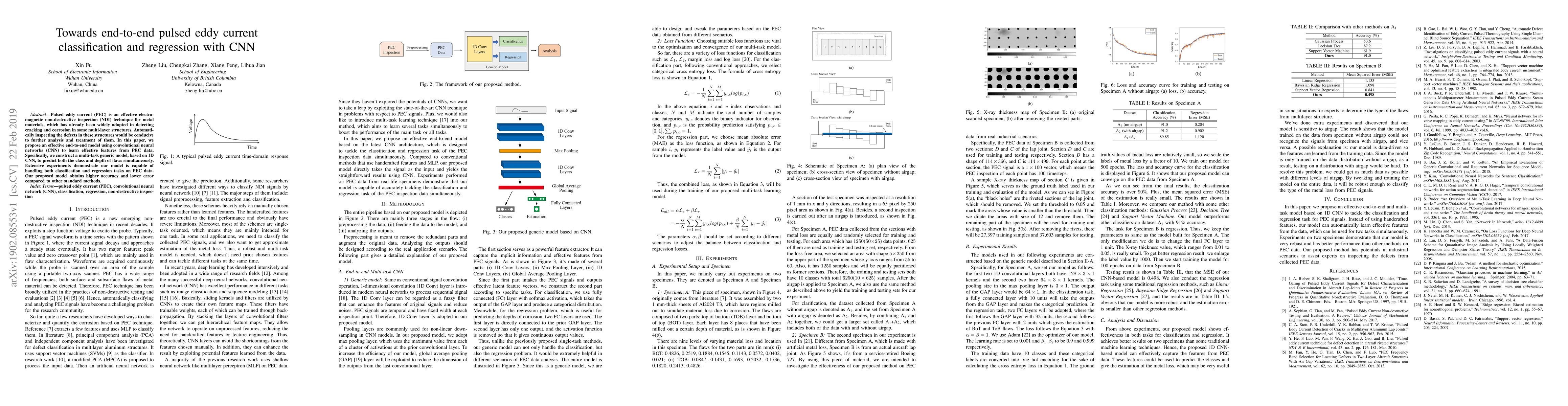 This paper proposes an end-to-end convolutional neural network (CNN) model for classifying and regressing pulsed eddy current (PEC) data to detect defects in multi-layer structures. The model achieves higher accuracy and lower error in both classification and regression tasks compared to standard methods.