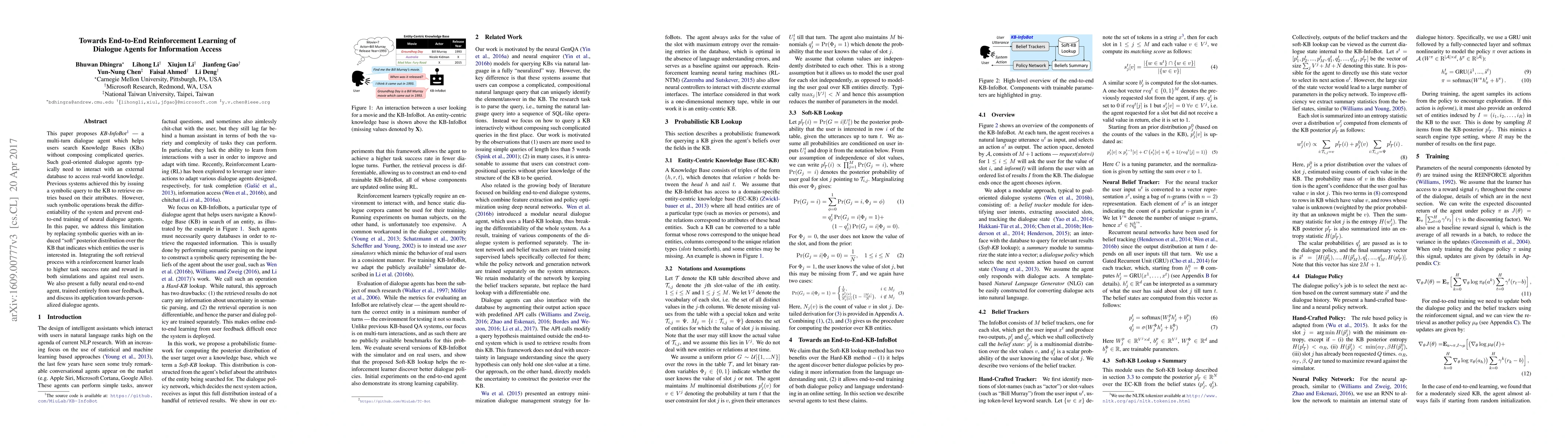 This paper introduces KB-InfoBot, a neural dialogue agent that enhances search in Knowledge Bases via reinforcement learning, enabling end-to-end training and improved interaction without complex queries, resulting in better performance and personalized user experiences.