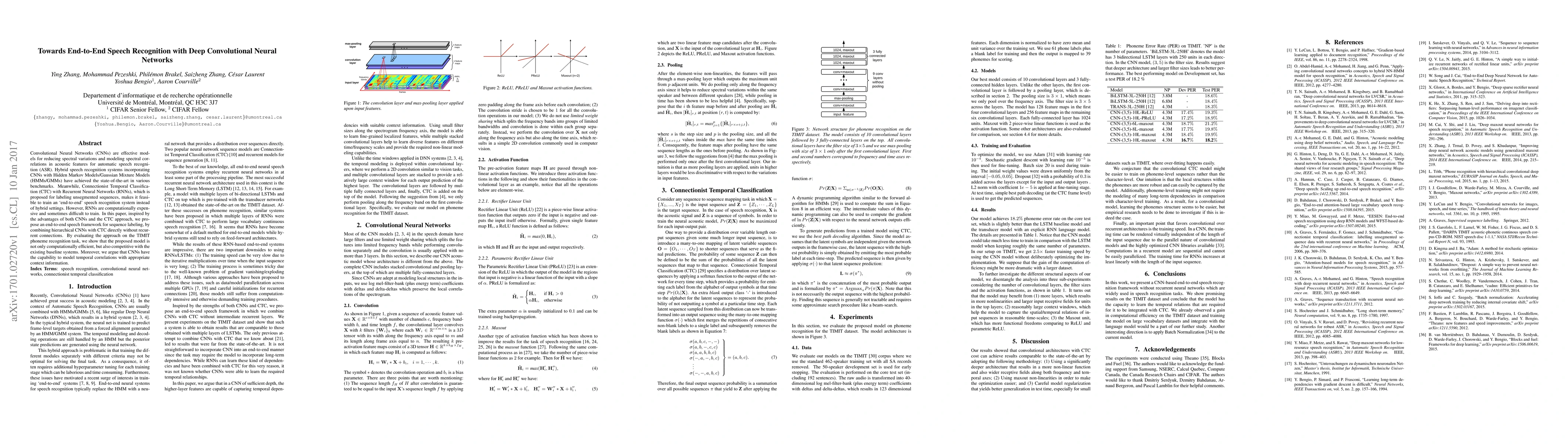 This paper proposes an end-to-end speech recognition framework combining hierarchical CNNs with Connectionist Temporal Classification (CTC) to replace computationally expensive RNNs. The approach demonstrates competitive performance and efficiency on the TIMIT phoneme recognition task.