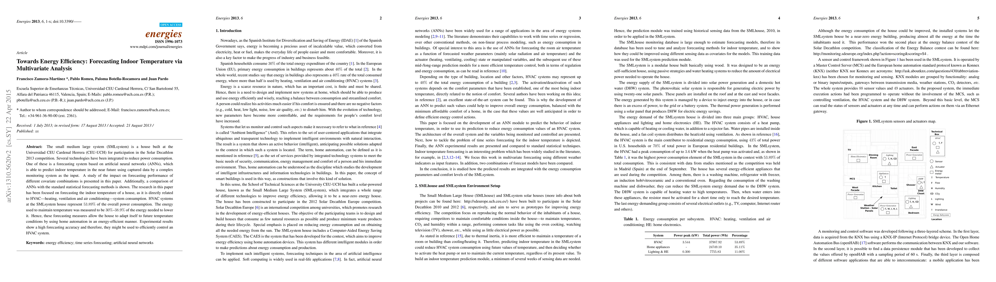 The small medium large system (SMLSystem) is a house built at the Universidad CEU Cardenal Herrera (CEU-UCH) for participation in the Solar Decathlon 2013 competition. Several technologies have been integrated to reduce power consumption. One of these is a forecasting system based on artificial neural networks (ANNs), which is able to predict indoor temperature in the near future using captured data by a complex monitoring system as the input. A study of the impact on forecasting performance of different covariate combinations is presented in this paper. Additionally, a comparison of ANNs with the standard statistical forecasting methods is shown. The research in this paper has been focused on forecasting the indoor temperature of a house, as it is directly related to HVAC---heating, ventilation and air conditioning---system consumption. HVAC systems at the SMLSystem house represent 53.9% of the overall power consumption. The energy used to maintain temperature was measured to be 30--38.9% of the energy needed to lower it. Hence, these forecasting measures allow the house to adapt itself to future temperature conditions by using home automation in an energy-efficient manner. Experimental results show a high forecasting accuracy and therefore, they might be used to efficiently control an HVAC system.