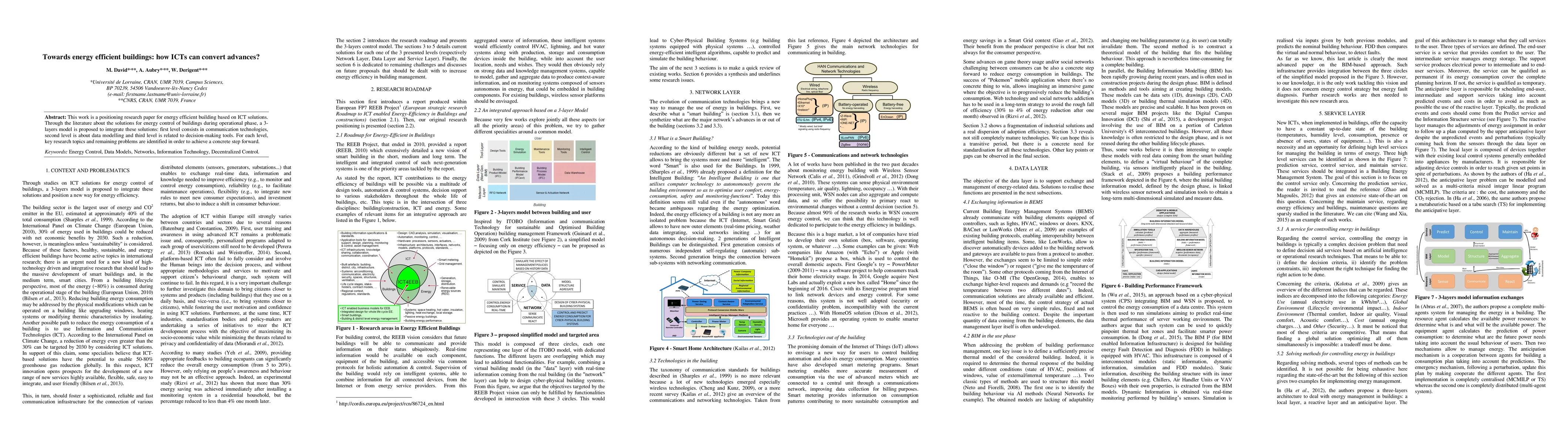 This work is a positioning research paper for energy efficient building based on ICT solutions. Through the literature about the solutions for energy control of buildings during operational phase, a 3-layers model is proposed to integrate these solutions: first level consists in communication technologies, second level is about data modelling and third level is related to decision-making tools. For each level, key research topics and remaining problems are identified in order to achieve a concrete step forward. 1. CONTEXT AND PROBLEMATICS Through studies on ICT solutions for energy control of buildings, a 3-layers model is proposed to integrate these solutions and position a new way for energy efficiency. The building sector is the largest user of energy and CO 2 emitter in the EU, estimated at approximately 40% of the total consumption (Sharples et al., 1999). According to the International Panel on Climate Change (European Union, 2010), 30% of energy used in buildings could be reduced with net economic benefits by 2030. Such a reduction, however, is meaningless unless "sustainability" is considered. Because of these factors, healthy, sustainable, and energy efficient buildings have become active topics in international research; there is an urgent need for a new kind of high-technology driven and integrative research that should lead to the massive development of smart buildings and, in the medium term, smart cities. From a building lifecycle perspective, most of the energy (~80%) is consumed during the operational stage of the building (European Union, 2010) (Bilsen et al., 2013). Reducing building energy consumption may be addressed by the physical modifications which can be operated on a building like upgrading windows, heating systems or modifying thermic characteristics by insulating. Another possible path to reduce the energy consumption of a building is to use Information and Communication Technologies (ICT). According to the International Panel on Climate Change, a reduction of energy even greater than the 30% can be targeted by 2030 by considering ICT solutions. In support of this claim, some specialists believe that ICT-based solutions have the potential to enable 50-80% greenhouse gas reduction globally. In this respect, ICT innovation opens prospects for the development of a new range of new services highly available, flexible, safe, easy to integrate, and user friendly (Bilsen et al., 2013). This, in turn, should foster a sophisticated, reliable and fast communication infrastructure for the connection of various distributed elements (sensors, generators, substations...) that enables to exchange real-time data, information and knowledge needed to improve efficiency (e.g., to monitor and control energy consumption), reliability (e.g., to facilitate maintenance operations), flexibility (e.g., to integrate new rules to meet new consumer expectations), and investment returns, but also to induce a shift in consumer behaviour.