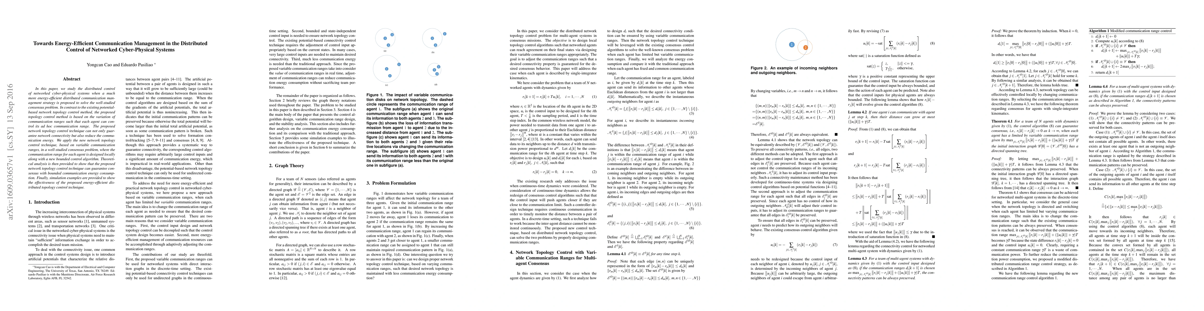This paper proposes a novel energy-efficient distributed communication management strategy for networked cyber-physical systems, focusing on variable communication ranges to achieve consensus while minimizing energy consumption. The new topology control method guarantees network connectivity and reduces communication energy, with theoretical analysis and simulation results validating its effectiveness.