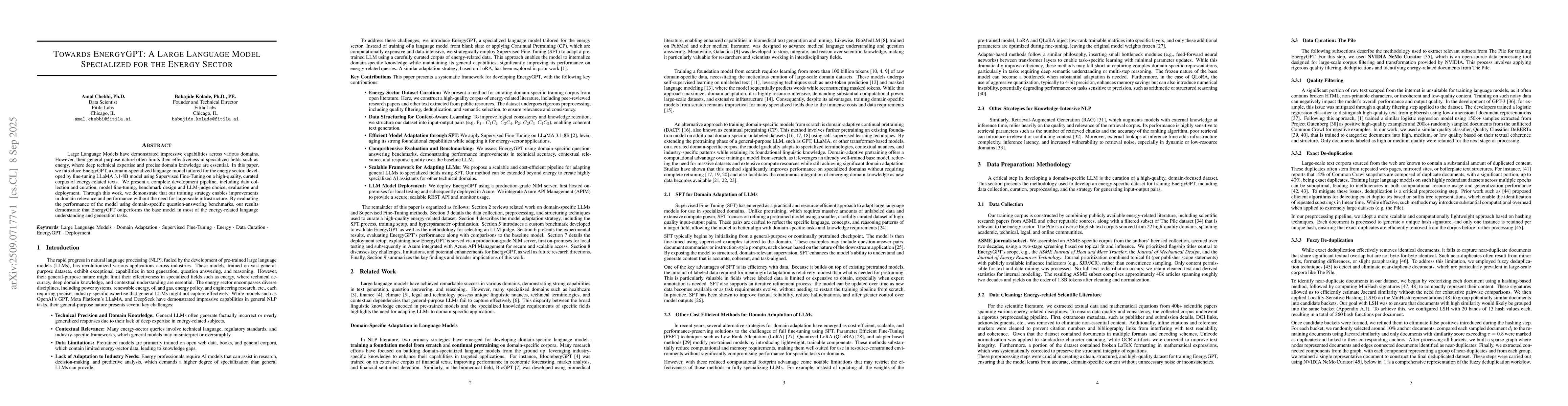 Large Language Models have demonstrated impressive capabilities across various domains. However, their general-purpose nature often limits their effectiveness in specialized fields such as energy, where deep technical expertise and precise domain knowledge are essential. In this paper, we introduce EnergyGPT, a domain-specialized language model tailored for the energy sector, developed by fine-tuning LLaMA 3.1-8B model using Supervised Fine-Tuning on a high-quality, curated corpus of energy-related texts. We present a complete development pipeline, including data collection and curation, model fine-tuning, benchmark design and LLM-judge choice, evaluation and deployment. Through this work, we demonstrate that our training strategy enables improvements in domain relevance and performance without the need for large-scale infrastructure. By evaluating the performance of the model using domain-specific question-answering benchmarks, our results demonstrate that EnergyGPT outperforms the base model in most of the energy-related language understanding and generation tasks.