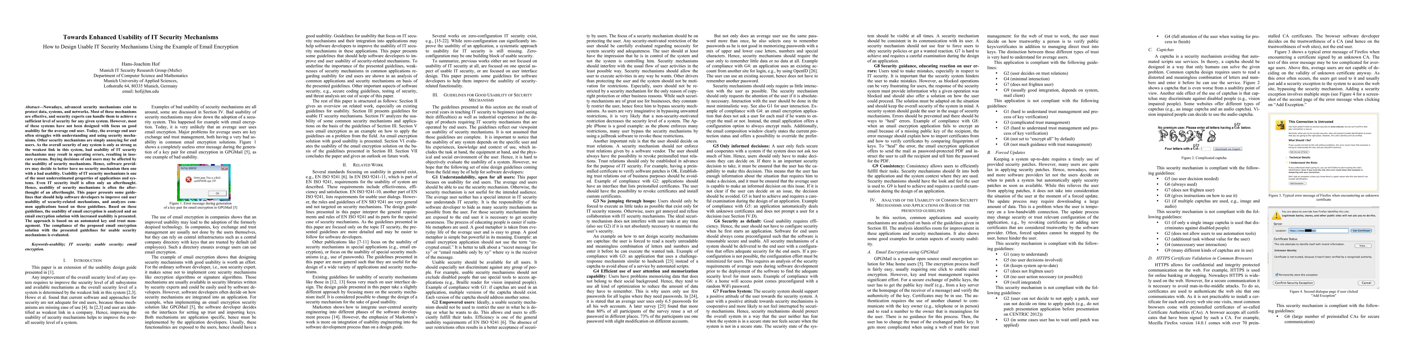 Nowadays, advanced security mechanisms exist to protect data, systems, and networks. Most of these mechanisms are effective, and security experts can handle them to achieve a sufficient level of security for any given system. However, most of these systems have not been designed with focus on good usability for the average end user. Today, the average end user often struggles with understanding and using security mecha-nisms. Other security mechanisms are simply annoying for end users. As the overall security of any system is only as strong as the weakest link in this system, bad usability of IT security mechanisms may result in operating errors, resulting in inse-cure systems. Buying decisions of end users may be affected by the usability of security mechanisms. Hence, software provid-ers may decide to better have no security mechanism then one with a bad usability. Usability of IT security mechanisms is one of the most underestimated properties of applications and sys-tems. Even IT security itself is often only an afterthought. Hence, usability of security mechanisms is often the after-thought of an afterthought. This paper presents some guide-lines that should help software developers to improve end user usability of security-related mechanisms, and analyzes com-mon applications based on these guidelines. Based on these guidelines, the usability of email encryption is analyzed and an email encryption solution with increased usability is presented. The approach is based on an automated key and trust man-agement. The compliance of the proposed email encryption solution with the presented guidelines for usable security mechanisms is evaluated.