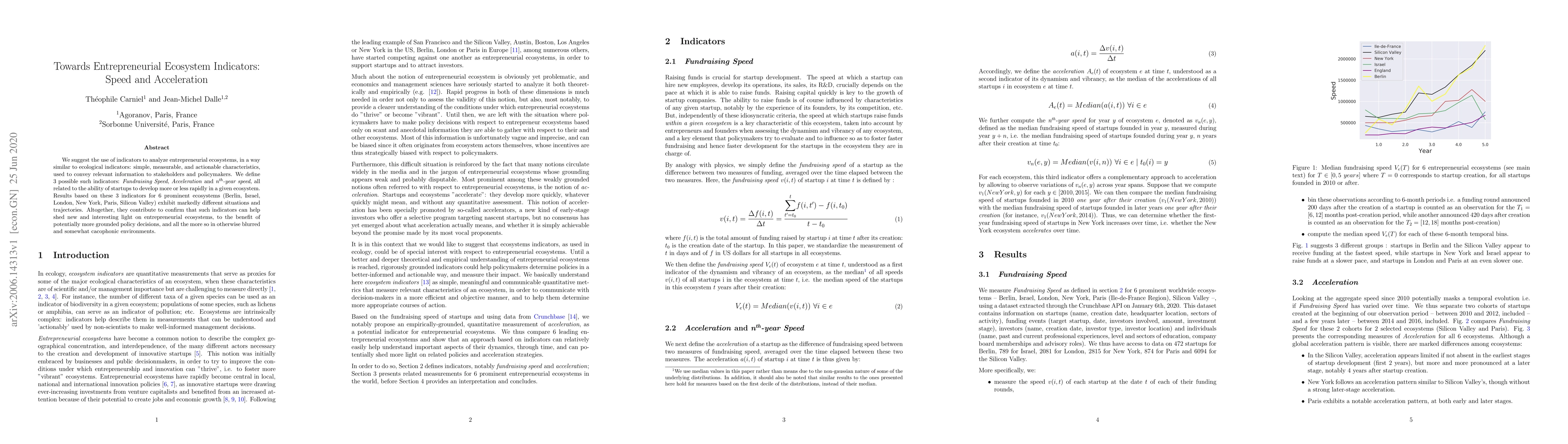 We suggest the use of indicators to analyze entrepreneurial ecosystems, in a way similar to ecological indicators: simple, measurable, and actionable characteristics, used to convey relevant information to stakeholders and policymakers. We define 3 possible such indicators: Fundraising Speed, Acceleration and nth-year speed, all related to the ability of startups to develop more or less rapidly in a given ecosystem. Results based on these 3 indicators for 6 prominent ecosystems (Berlin, Israel, London, New York, Paris, Silicon Valley) exhibit markedly different situations and trajectories. Altogether, they contribute to confirm that such indicators can help shed new and interesting light on entrepreneurial ecosystems, to the benefit of potentially more grounded policy decisions, and all the more so in otherwise blurred and somewhat cacophonic environments.