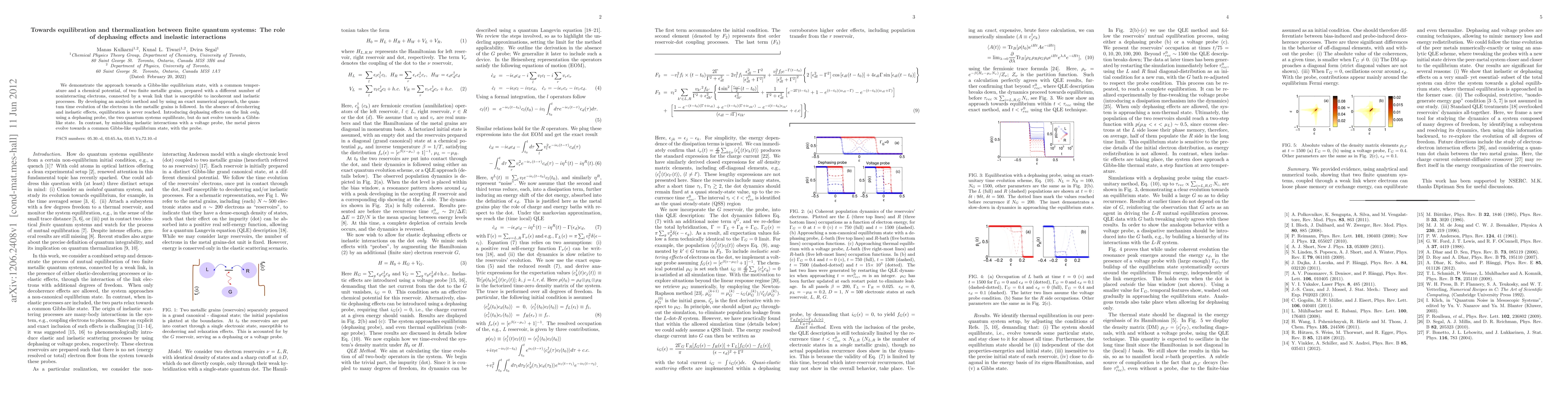 We demonstrate the approach towards a Gibbs-like equilibrium state, with a common temperature and a chemical potential, of two finite metallic grains, prepared with a different number of noninteracting electrons, connected by a weak link that is susceptible to incoherent and inelastic processes. By developing an analytic method and by using an exact numerical approach, the quantum time evolution of the electrons in the metallic grains is followed. In the absence of decoherring and inelastic effects, equilibration is never reached. Introducing dephasing effects on the link only, using a dephasing probe, the two quantum systems equilibrate, but do not evolve towards a Gibbs-like state. In contrast, by mimicking inelastic interactions with a voltage probe, the metal pieces evolve towards a common Gibbs-like equilibrium state, with the probe.