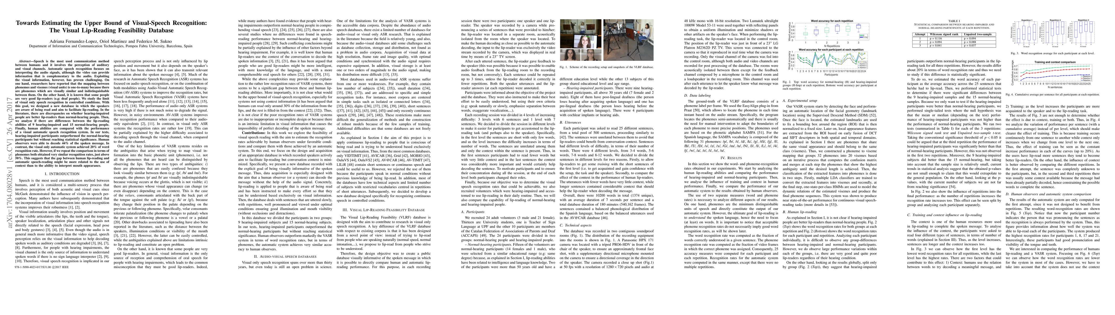 This paper investigates the feasibility of visual-only speech recognition through a new database designed to facilitate lip-reading. It compares the lip-reading abilities of hearing-impaired versus normal-hearing individuals, finding that hearing-impaired participants performed better but not significantly so. The study concludes that the gap between human lip-reading and automatic systems may be due more to contextual understanding than to visual interpretation alone.