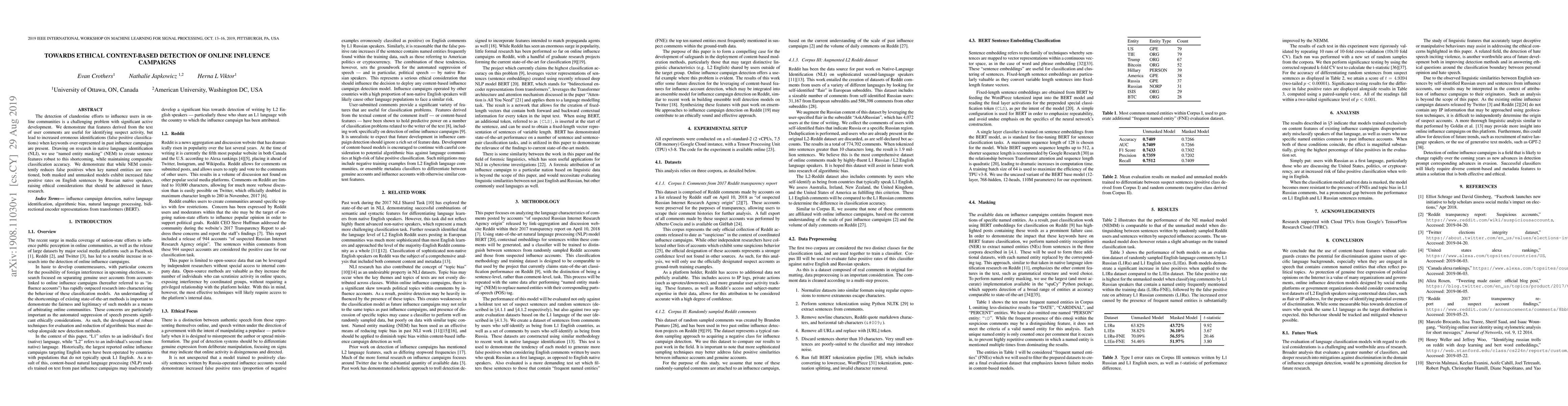 This paper proposes a method for detecting online influence campaigns using text features from user comments, highlighting the issue of false positives due to over-represented keywords. It introduces "named entity masking" to improve robustness, but notes increased false positives for English sentences from Russian speakers, raising ethical concerns for future research.