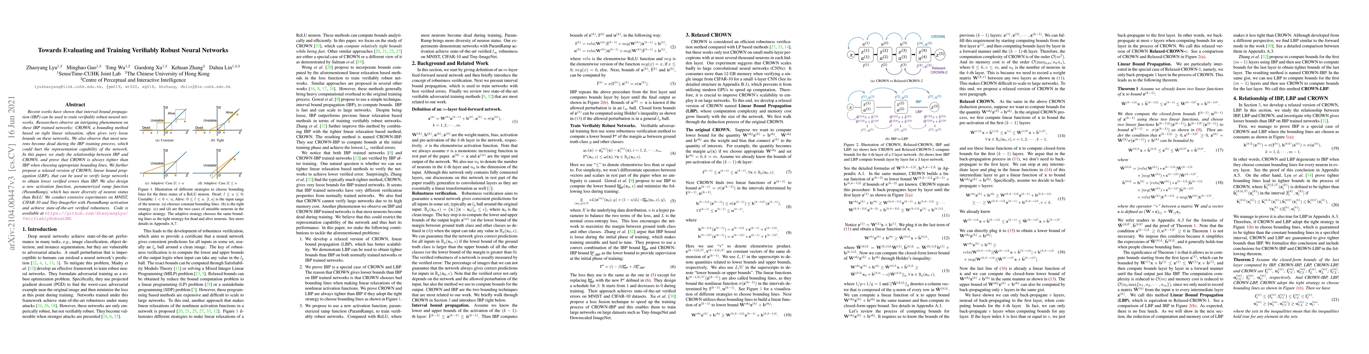 Recent works have shown that interval bound propagation (IBP) can be used to train verifiably robust neural networks. Reseachers observe an intriguing phenomenon on these IBP trained networks: CROWN, a bounding method based on tight linear relaxation, often gives very loose bounds on these networks. We also observe that most neurons become dead during the IBP training process, which could hurt the representation capability of the network. In this paper, we study the relationship between IBP and CROWN, and prove that CROWN is always tighter than IBP when choosing appropriate bounding lines. We further propose a relaxed version of CROWN, linear bound propagation (LBP), that can be used to verify large networks to obtain lower verified errors than IBP. We also design a new activation function, parameterized ramp function (ParamRamp), which has more diversity of neuron status than ReLU. We conduct extensive experiments on MNIST, CIFAR-10 and Tiny-ImageNet with ParamRamp activation and achieve state-of-the-art verified robustness. Code and the appendix are available at https://github.com/ZhaoyangLyu/VerifiablyRobustNN.