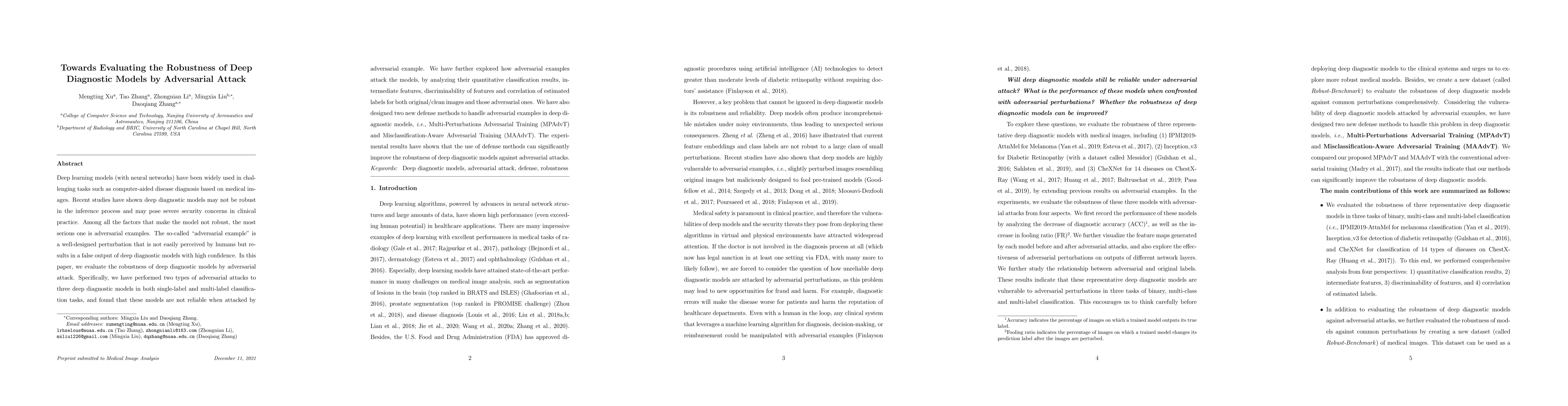 This paper investigates the robustness of deep diagnostic models in medical image analysis by simulating adversarial attacks, revealing significant vulnerabilities in the models. It introduces two new defense methods, MPAdvT and MAAdvT, which enhance model robustness against adversarial examples, as shown by improved performance in experimental tests.