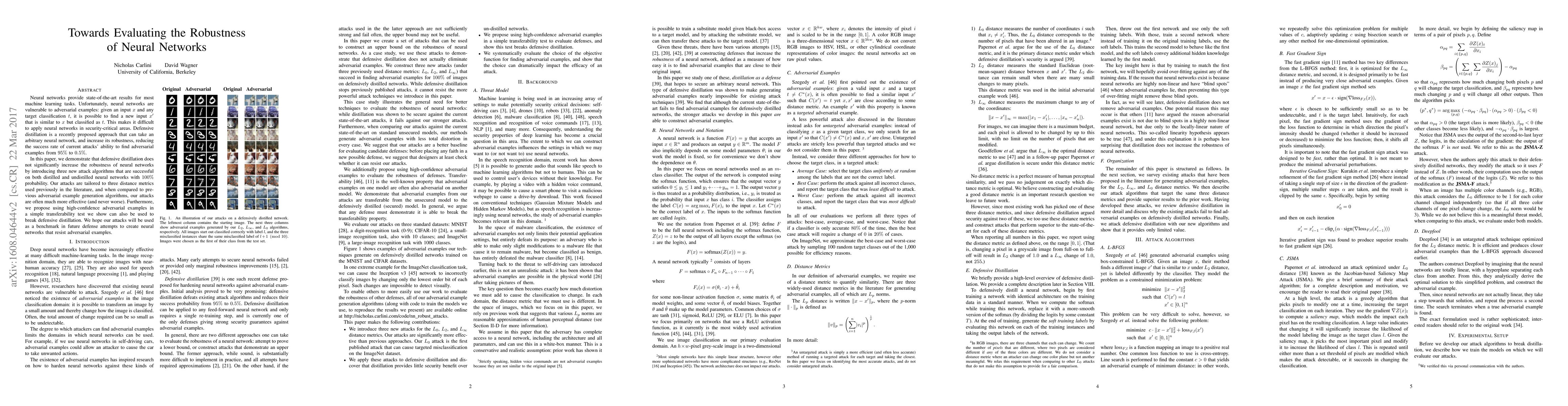 Neural networks provide state-of-the-art results for most machine learning tasks. Unfortunately, neural networks are vulnerable to adversarial examples: given an input $x$ and any target classification $t$, it is possible to find a new input $x'$ that is similar to $x$ but classified as $t$. This makes it difficult to apply neural networks in security-critical areas. Defensive distillation is a recently proposed approach that can take an arbitrary neural network, and increase its robustness, reducing the success rate of current attacks' ability to find adversarial examples from $95\%$ to $0.5\%$. In this paper, we demonstrate that defensive distillation does not significantly increase the robustness of neural networks by introducing three new attack algorithms that are successful on both distilled and undistilled neural networks with $100\%$ probability. Our attacks are tailored to three distance metrics used previously in the literature, and when compared to previous adversarial example generation algorithms, our attacks are often much more effective (and never worse). Furthermore, we propose using high-confidence adversarial examples in a simple transferability test we show can also be used to break defensive distillation. We hope our attacks will be used as a benchmark in future defense attempts to create neural networks that resist adversarial examples.