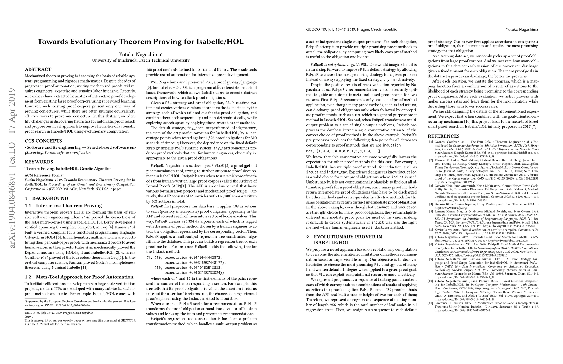 This paper explores the use of evolutionary computation to enhance heuristics for automatic proof search in Isabelle/HOL, aiming to address the challenges of discovering multiple effective proof strategies beyond those found in existing proof corpora. The proposed method leverages evolutionary techniques to improve the automation of mechanized theorem proving.