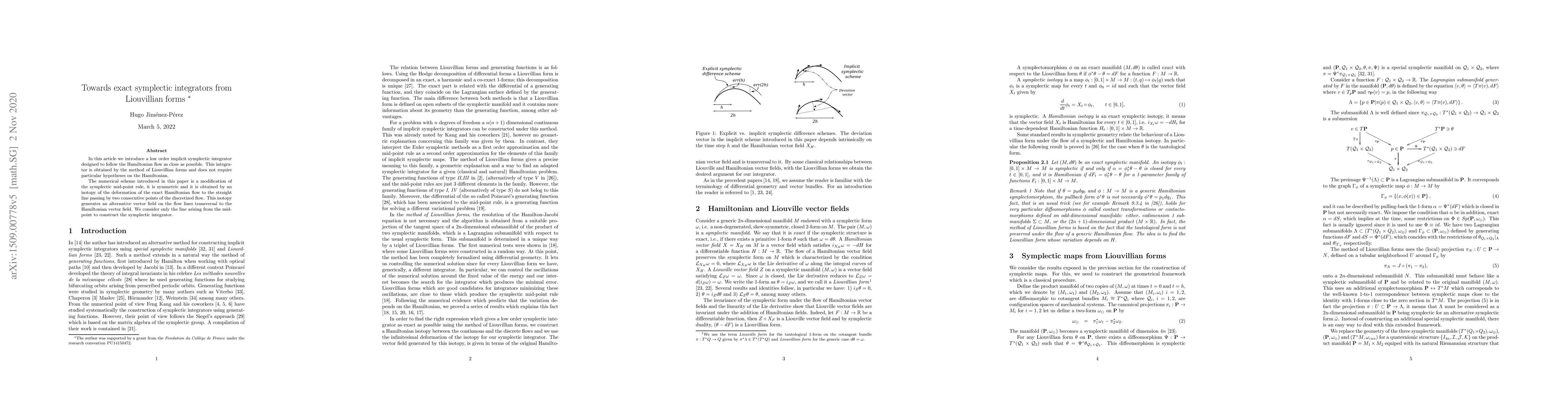 In this article we introduce a low order implicit symplectic integrator designed to follow the Hamiltonian flow as close as possible. This integrator is obtained by the method of Liouvillian forms and does not require particular hypotheses on the Hamiltonian. The numerical scheme introduced in this paper is a modification of the symplectic mid-point rule, it is symmetric and it is obtained by an isotopy of the deformation of the exact Hamiltonian flow to the straight line passing by two consecutive points of the discretized flow. This isotopy generates an alternative vector field on the flow lines transversal to the Hamiltonian vector field. We consider only the line arising from the mid-point to construct the symplectic integrator.