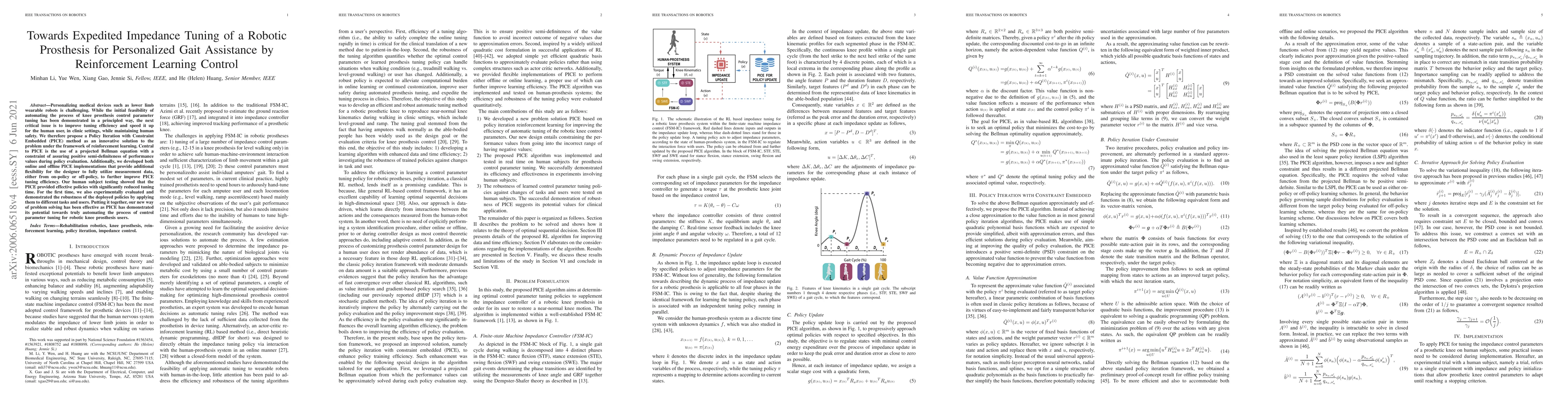 This paper proposes a policy iteration with constraint embedded (PICE) method for expediting impedance tuning of robotic prostheses using reinforcement learning. The PICE method, which incorporates a projected Bellman equation and positive semidefiniteness constraints, significantly reduces tuning time and demonstrates robustness across different tasks and users.
