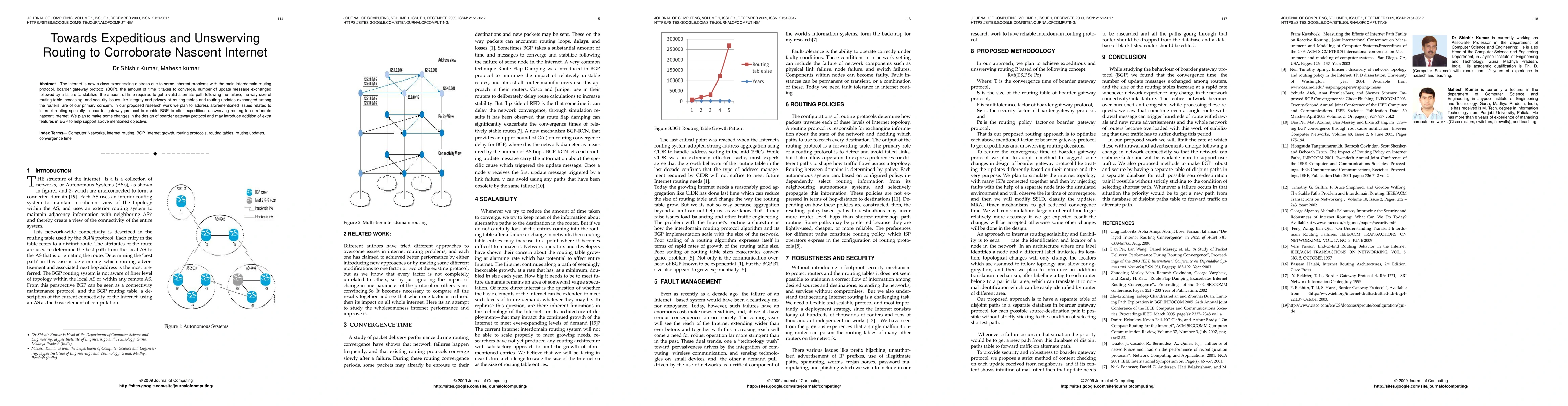 The internet is now-a-days experiencing a stress due to some inherent problems with the main interdomain routing protocol, boarder gateway protocol (BGP), the amount of time it takes to converge, number of update message exchanged followed by a failure to stabilize, the amount of time required to get a valid alternate path following the failure, the way size of routing table increasing, and security issues like integrity and privacy of routing tables and routing updates exchanged among the routers, are of our primary concern. In our proposed research work we plan to address aforementioned issues related to internet routing specially in boarder gateway protocol to enable BGP to offer expeditious unswerving routing to corroborate nascent internet. We plan to make some changes in the design of boarder gateway protocol and may introduce addition of extra features in BGP to help support above mentioned objective.