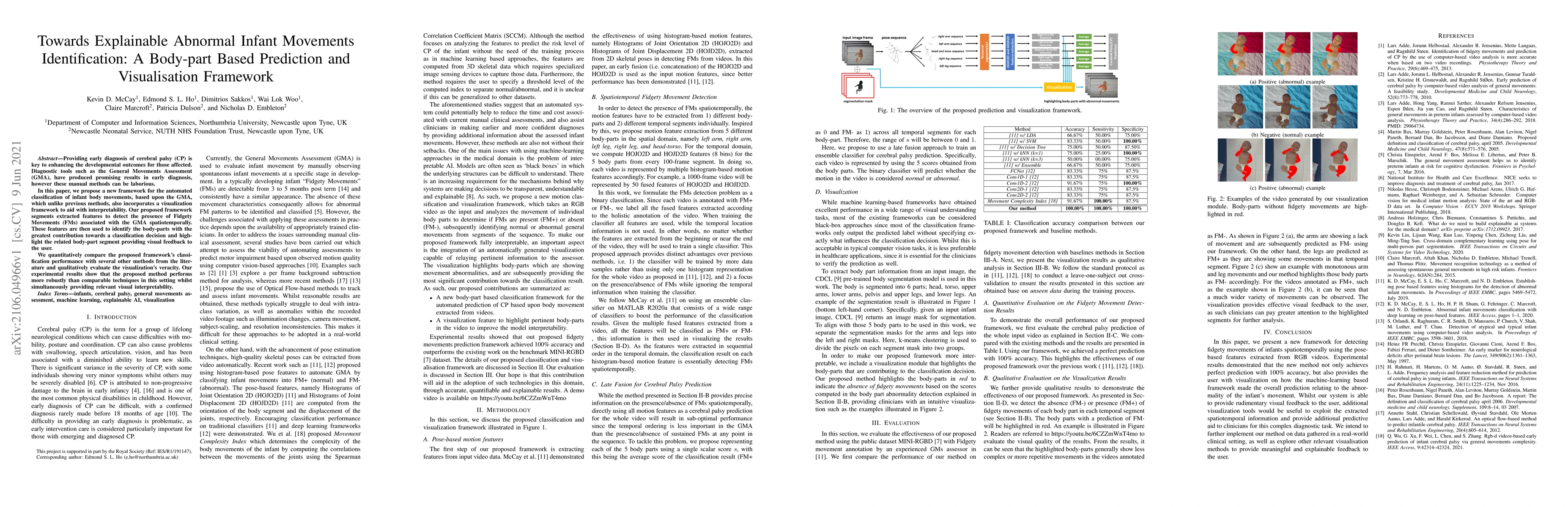 Providing early diagnosis of cerebral palsy (CP) is key to enhancing the developmental outcomes for those affected. Diagnostic tools such as the General Movements Assessment (GMA), have produced promising results in early diagnosis, however these manual methods can be laborious. In this paper, we propose a new framework for the automated classification of infant body movements, based upon the GMA, which unlike previous methods, also incorporates a visualization framework to aid with interpretability. Our proposed framework segments extracted features to detect the presence of Fidgety Movements (FMs) associated with the GMA spatiotemporally. These features are then used to identify the body-parts with the greatest contribution towards a classification decision and highlight the related body-part segment providing visual feedback to the user. We quantitatively compare the proposed framework's classification performance with several other methods from the literature and qualitatively evaluate the visualization's veracity. Our experimental results show that the proposed method performs more robustly than comparable techniques in this setting whilst simultaneously providing relevant visual interpretability.