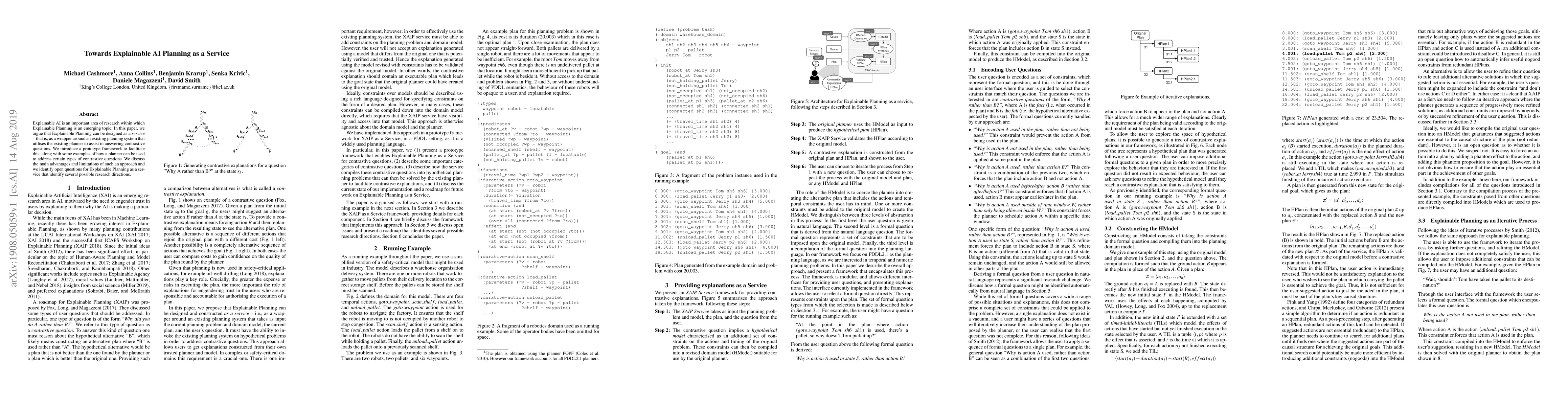 This paper proposes Explainable Planning as a service, utilizing a wrapper around existing planning systems to answer contrastive questions. The prototype framework demonstrates its potential and outlines both advantages and limitations, while also identifying open questions for future research directions.