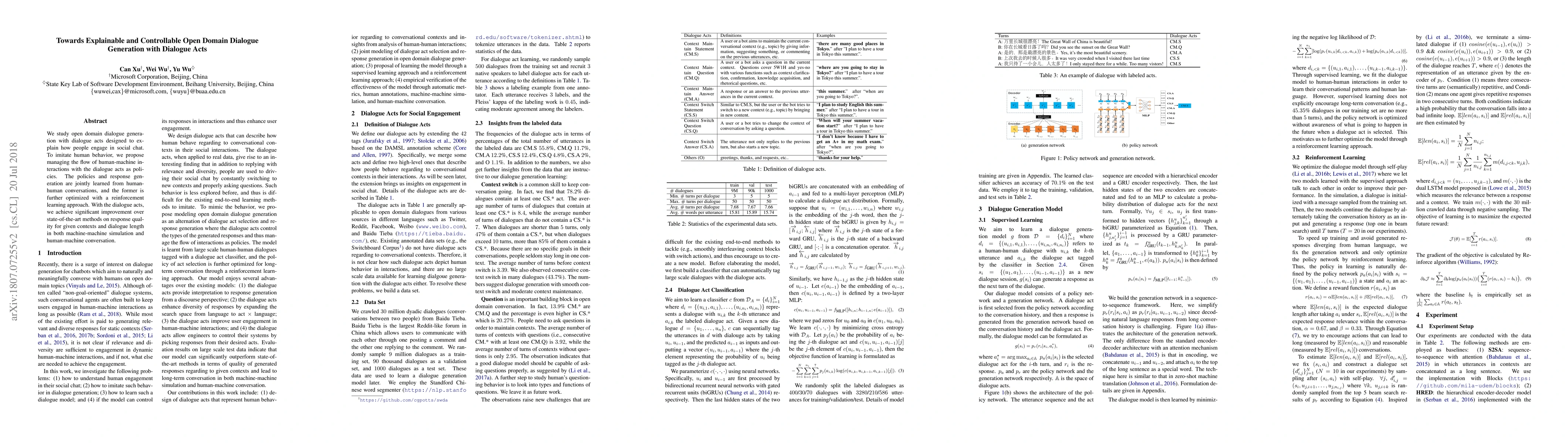 This paper proposes a method for open domain dialogue generation using dialogue acts to mimic human social interactions, optimizing dialogue act policies with reinforcement learning to improve response quality and length. The approach outperforms existing methods in both simulated and real human-machine conversations.