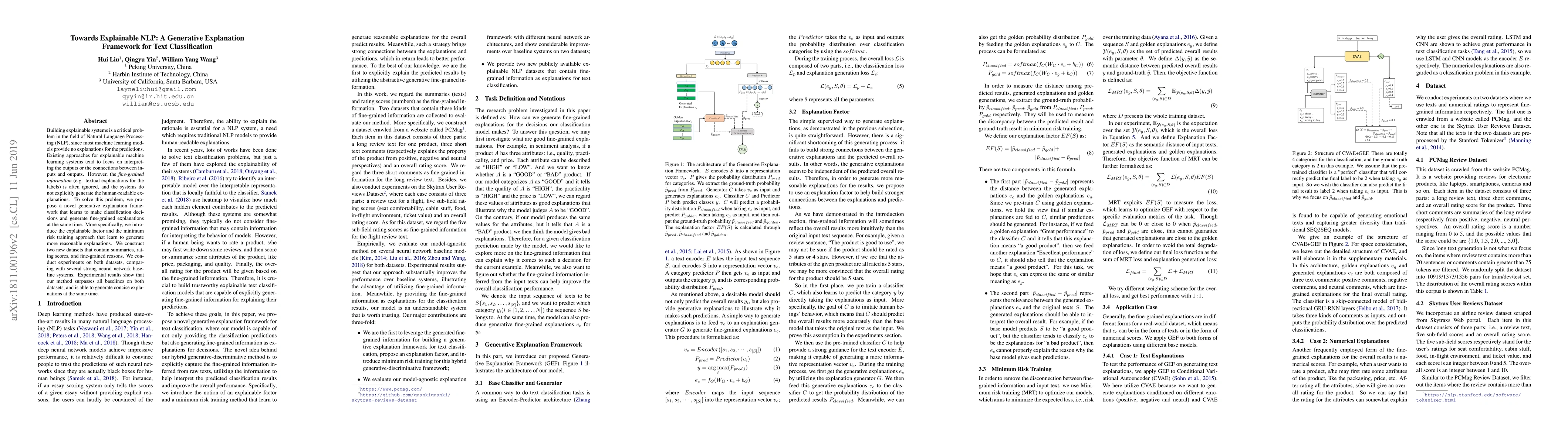 The paper proposes a generative explanation framework for text classification that simultaneously makes classification decisions and generates fine-grained, human-readable explanations. The method employs the explainable factor and minimum risk training to improve explanation quality, and it outperforms neural network baselines in generating concise explanations.