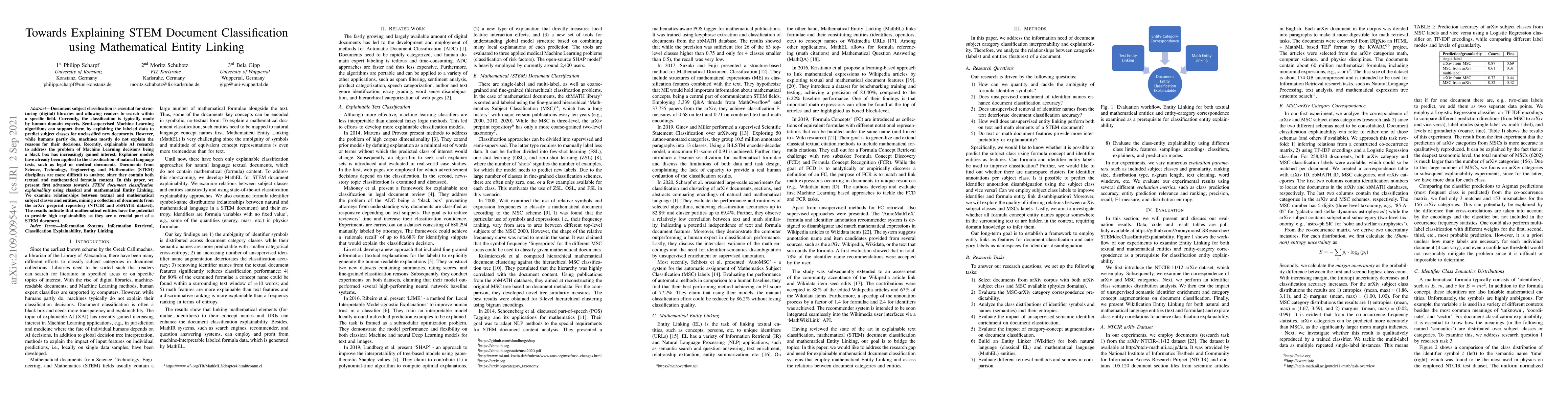 Document subject classification is essential for structuring (digital) libraries and allowing readers to search within a specific field. Currently, the classification is typically made by human domain experts. Semi-supervised Machine Learning algorithms can support them by exploiting the labeled data to predict subject classes for unclassified new documents. However, while humans partly do, machines mostly do not explain the reasons for their decisions. Recently, explainable AI research to address the problem of Machine Learning decisions being a black box has increasingly gained interest. Explainer models have already been applied to the classification of natural language texts, such as legal or medical documents. Documents from Science, Technology, Engineering, and Mathematics (STEM) disciplines are more difficult to analyze, since they contain both textual and mathematical formula content. In this paper, we present first advances towards STEM document classification explainability using classical and mathematical Entity Linking. We examine relationships between textual and mathematical subject classes and entities, mining a collection of documents from the arXiv preprint repository (NTCIR and zbMATH dataset). The results indicate that mathematical entities have the potential to provide high explainability as they are a crucial part of a STEM document.