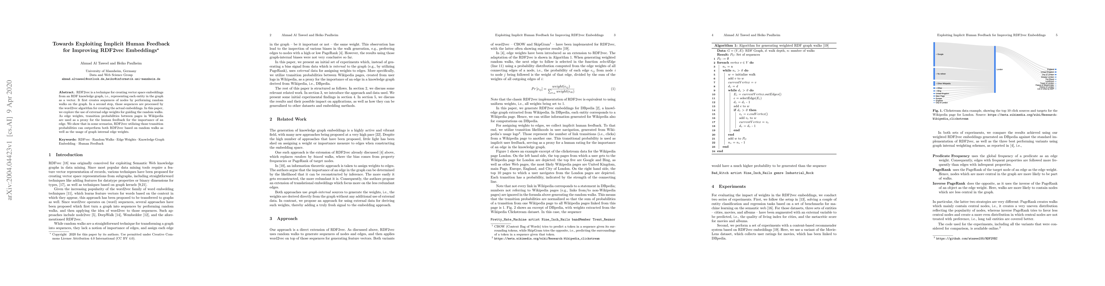 RDF2vec is a technique for creating vector space embeddings from an RDF knowledge graph, i.e., representing each entity in the graph as a vector. It first creates sequences of nodes by performing random walks on the graph. In a second step, those sequences are processed by the word2vec algorithm for creating the actual embeddings. In this paper, we explore the use of external edge weights for guiding the random walks. As edge weights, transition probabilities between pages in Wikipedia are used as a proxy for the human feedback for the importance of an edge. We show that in some scenarios, RDF2vec utilizing those transition probabilities can outperform both RDF2vec based on random walks as well as the usage of graph internal edge weights.