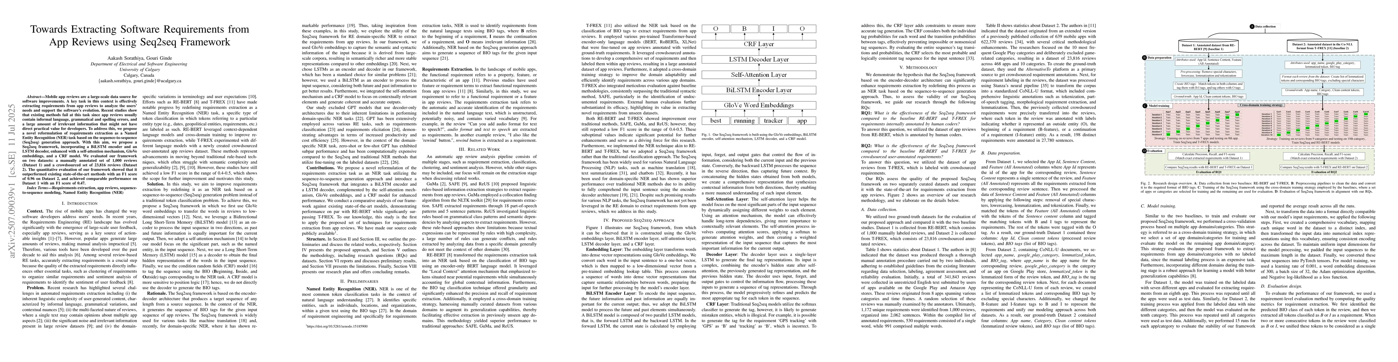 Mobile app reviews are a large-scale data source for software improvements. A key task in this context is effectively extracting requirements from app reviews to analyze the users' needs and support the software's evolution. Recent studies show that existing methods fail at this task since app reviews usually contain informal language, grammatical and spelling errors, and a large amount of irrelevant information that might not have direct practical value for developers. To address this, we propose a novel reformulation of requirements extraction as a Named Entity Recognition (NER) task based on the sequence-to-sequence (Seq2seq) generation approach. With this aim, we propose a Seq2seq framework, incorporating a BiLSTM encoder and an LSTM decoder, enhanced with a self-attention mechanism, GloVe embeddings, and a CRF model. We evaluated our framework on two datasets: a manually annotated set of 1,000 reviews (Dataset 1) and a crowdsourced set of 23,816 reviews (Dataset 2). The quantitative evaluation of our framework showed that it outperformed existing state-of-the-art methods with an F1 score of 0.96 on Dataset 2, and achieved comparable performance on Dataset 1 with an F1 score of 0.47.