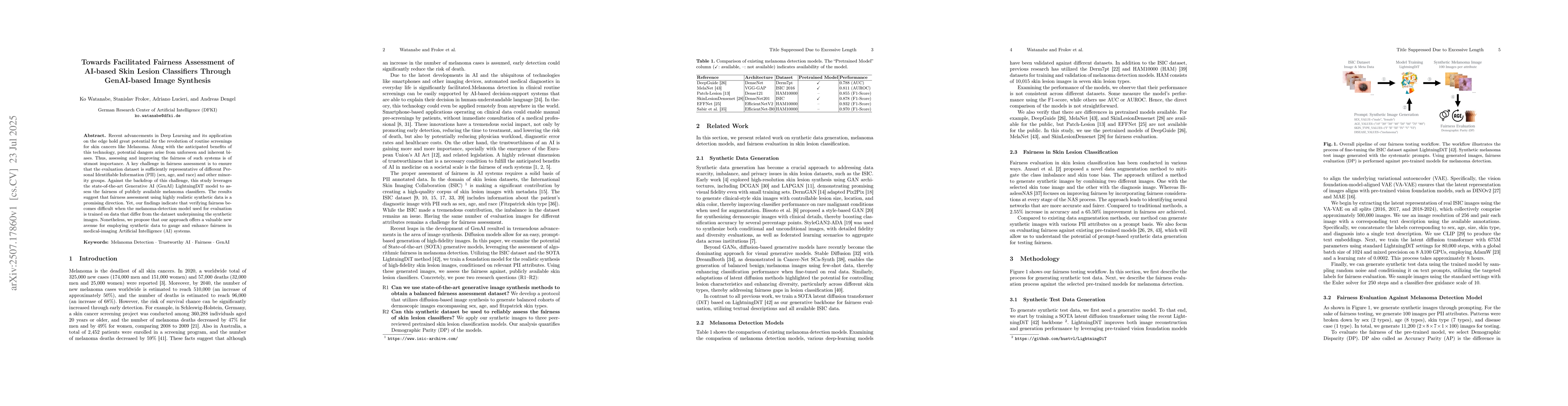 Recent advancements in Deep Learning and its application on the edge hold great potential for the revolution of routine screenings for skin cancers like Melanoma. Along with the anticipated benefits of this technology, potential dangers arise from unforseen and inherent biases. Thus, assessing and improving the fairness of such systems is of utmost importance. A key challenge in fairness assessment is to ensure that the evaluation dataset is sufficiently representative of different Personal Identifiable Information (PII) (sex, age, and race) and other minority groups. Against the backdrop of this challenge, this study leverages the state-of-the-art Generative AI (GenAI) LightningDiT model to assess the fairness of publicly available melanoma classifiers. The results suggest that fairness assessment using highly realistic synthetic data is a promising direction. Yet, our findings indicate that verifying fairness becomes difficult when the melanoma-detection model used for evaluation is trained on data that differ from the dataset underpinning the synthetic images. Nonetheless, we propose that our approach offers a valuable new avenue for employing synthetic data to gauge and enhance fairness in medical-imaging GenAI systems.