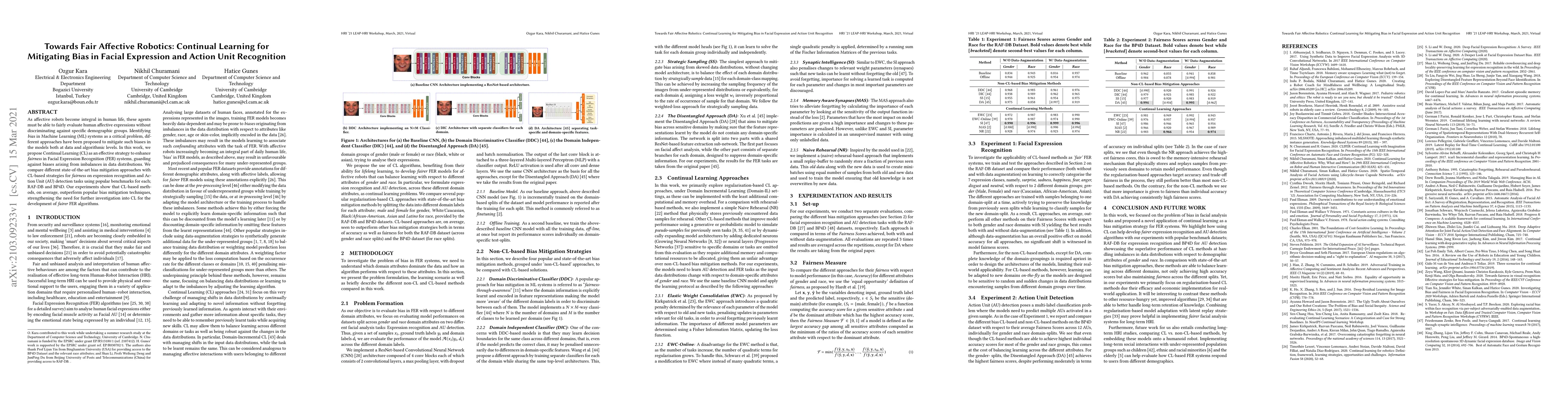 This paper explores Continual Learning (CL) as a method to mitigate bias in Facial Expression Recognition (FER) systems, demonstrating its effectiveness over traditional bias mitigation techniques. Experiments on RAF-DB and BP4D datasets show that CL-based strategies outperform others in fairness, highlighting the potential of CL for developing unbiased affective robotics.