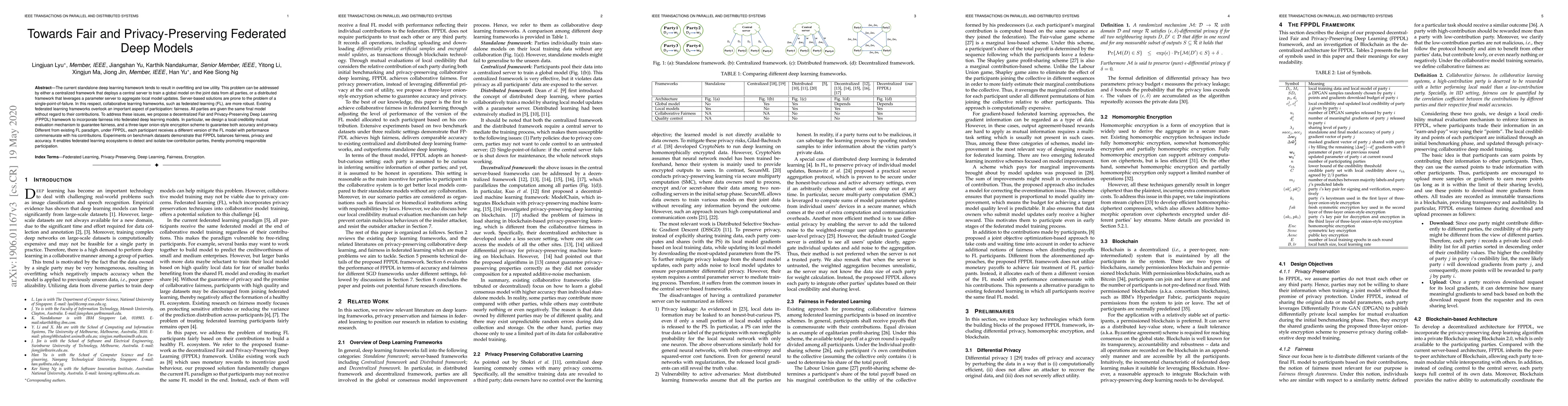 This paper proposes a decentralized Fair and Privacy-Preserving Deep Learning (FPPDL) framework to enhance federated learning by addressing fairness and privacy. The framework includes a local credibility mutual evaluation mechanism and a three-layer encryption scheme, enabling participants to receive tailored models based on their contributions, thus promoting responsible participation.