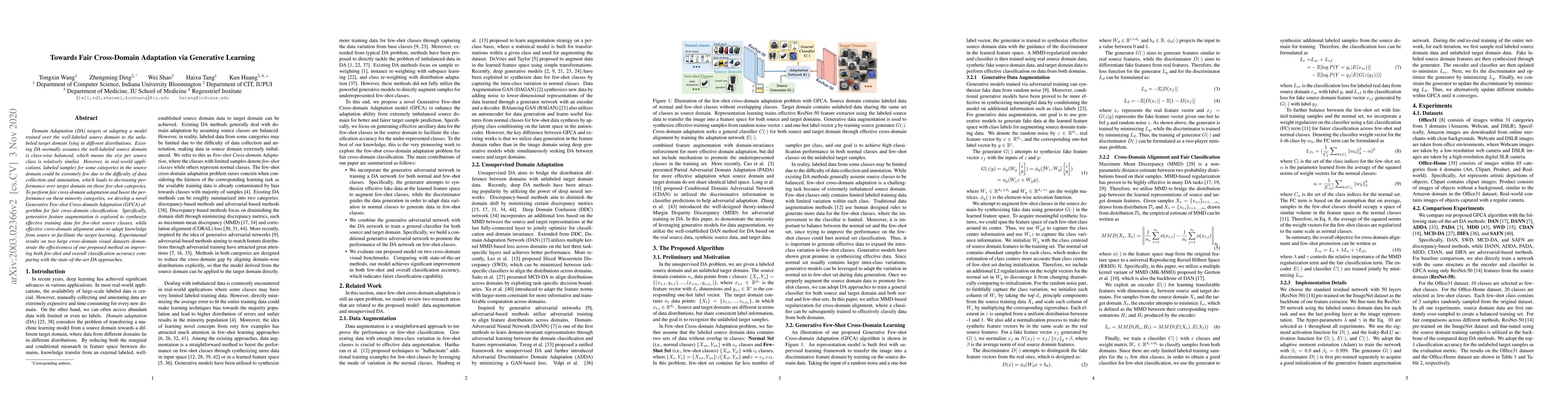Domain Adaptation (DA) targets at adapting a model trained over the well-labeled source domain to the unlabeled target domain lying in different distributions. Existing DA normally assumes the well-labeled source domain is class-wise balanced, which means the size per source class is relatively similar. However, in real-world applications, labeled samples for some categories in the source domain could be extremely few due to the difficulty of data collection and annotation, which leads to decreasing performance over target domain on those few-shot categories. To perform fair cross-domain adaptation and boost the performance on these minority categories, we develop a novel Generative Few-shot Cross-domain Adaptation (GFCA) algorithm for fair cross-domain classification. Specifically, generative feature augmentation is explored to synthesize effective training data for few-shot source classes, while effective cross-domain alignment aims to adapt knowledge from source to facilitate the target learning. Experimental results on two large cross-domain visual datasets demonstrate the effectiveness of our proposed method on improving both few-shot and overall classification accuracy comparing with the state-of-the-art DA approaches.