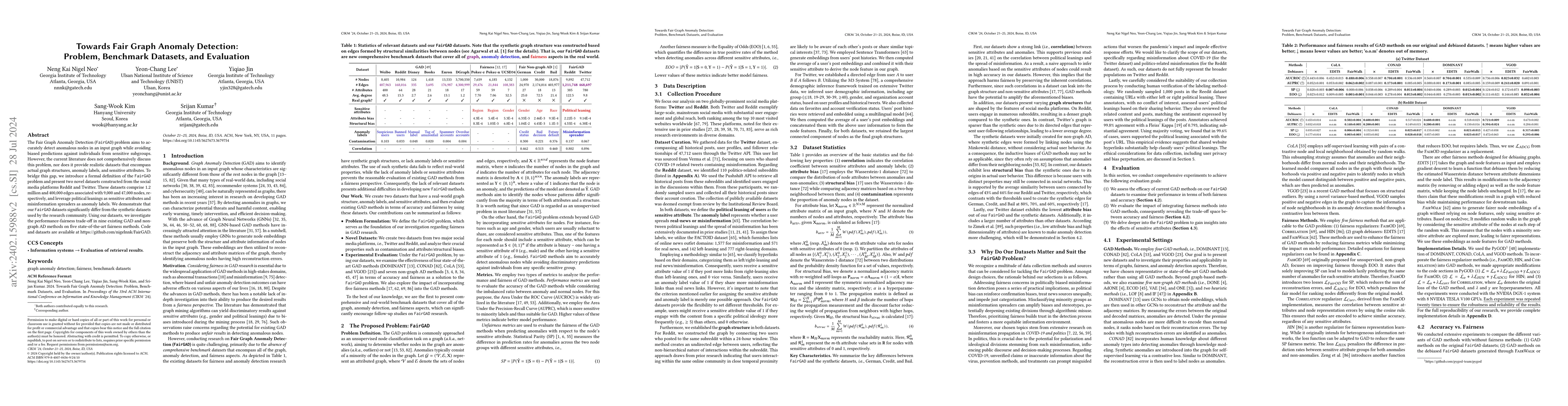 This paper introduces the Fair Graph Anomaly Detection (FairGAD) problem, defining it as detecting anomalous nodes in graphs while ensuring fairness. It presents two new datasets from Reddit and Twitter to address the lack of realistic data in current research, and evaluates the performance-fairness trade-off of eleven anomaly detection methods using these datasets.