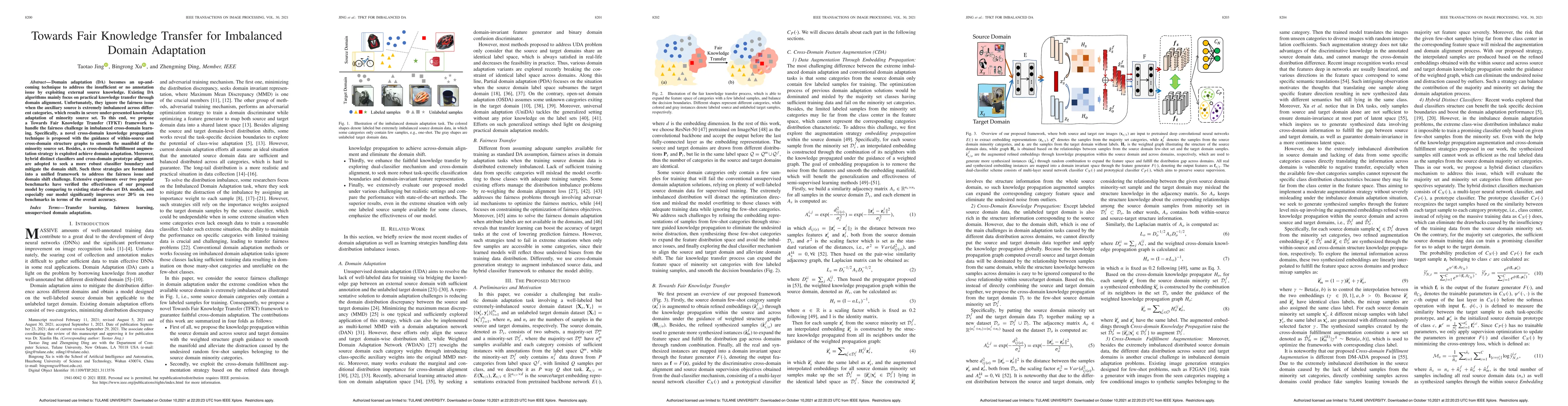 This paper proposes a Towards Fair Knowledge Transfer (TFKT) framework to address the imbalance issue in domain adaptation, enhancing minority source set knowledge through cross-domain mixup generation. The framework also employs dual classifiers and cross-domain prototype alignment to improve the robustness of the classifier and mitigate domain shift, achieving significant improvements in accuracy on benchmark datasets.