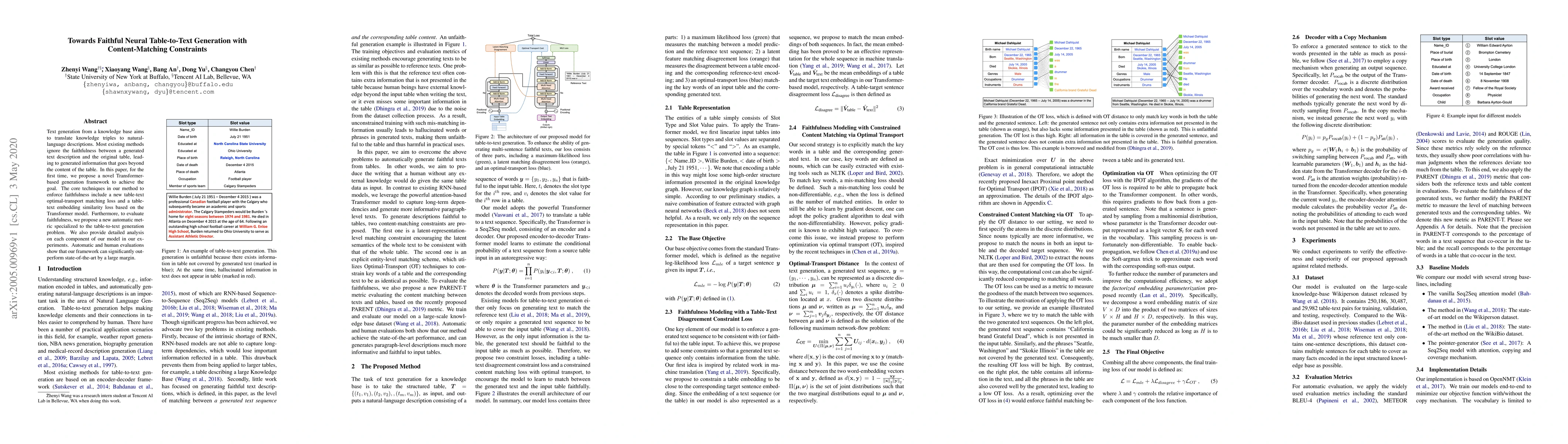 This paper proposes a Transformer-based framework to improve the faithfulness of neural table-to-text generation, using content-matching constraints through an optimal-transport matching loss and an embedding similarity loss. The authors also introduce a new automatic metric for evaluating faithfulness and demonstrate significant improvements over existing methods through both automatic and human evaluations.