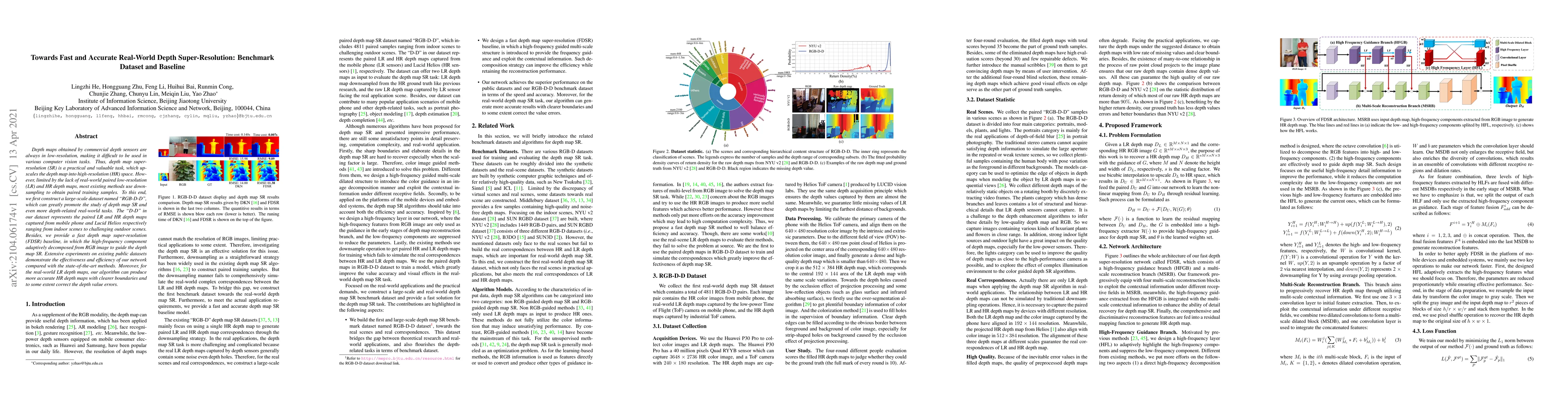 This paper introduces a new large-scale dataset, "RGB-D-D," for real-world depth map super-resolution (SR) and presents a fast depth map super-resolution (FDSR) baseline method. The dataset provides paired low-resolution and high-resolution depth maps, addressing the scarcity of real-world training samples. The proposed FDSR method uses high-frequency components from RGB images to guide depth map SR, demonstrating superior performance and efficiency compared to state-of-the-art methods.