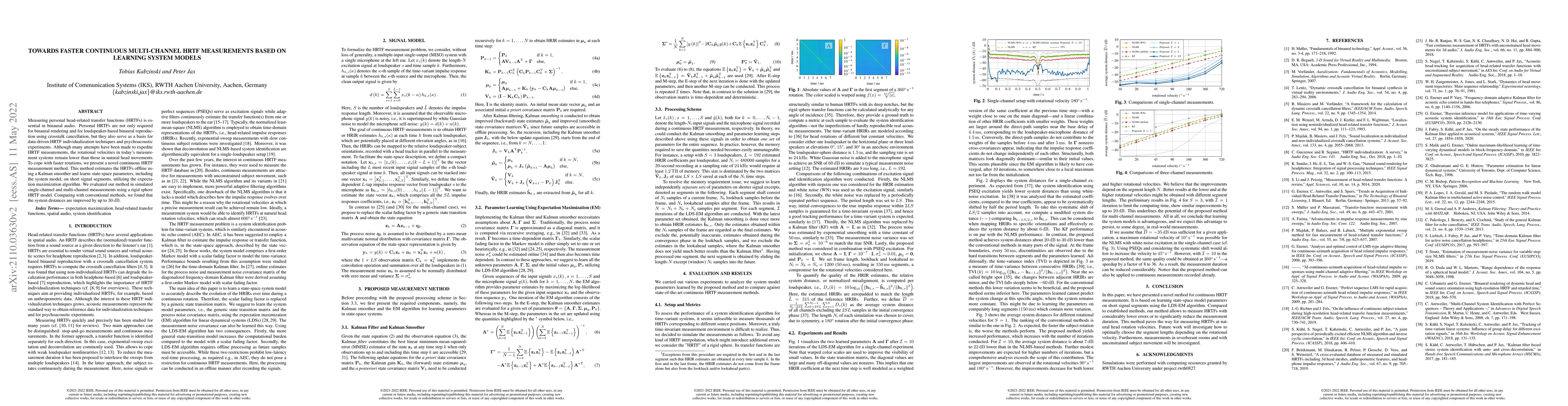 The research presents a novel continuous HRTF measurement method using a Kalman smoother to estimate HRTFs offline and learning state-space parameters, including the system model, on short signal segments via the expectation maximization algorithm.