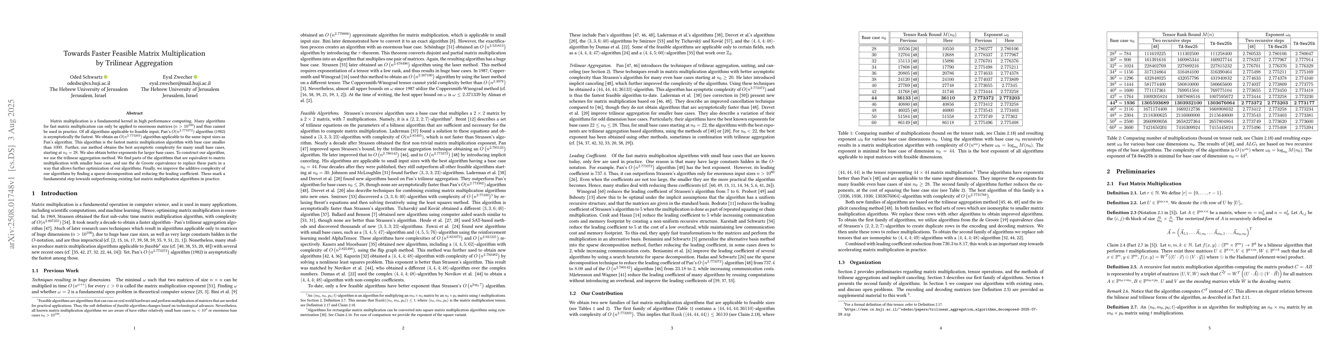 Matrix multiplication is a fundamental kernel in high performance computing. Many algorithms for fast matrix multiplication can only be applied to enormous matrices ($n>10^{100}$) and thus cannot be used in practice. Of all algorithms applicable to feasible input, Pan's $O(n^{2.773372})$ algorithm (1982) is asymptotically the fastest. We obtain an $O(n^{2.773203})$ algorithm applicable to the same input sizes as Pan's algorithm. This algorithm is the fastest matrix multiplication algorithm with base case smaller than $1000$. Further, our method obtains the best asymptotic complexity for many small base cases, starting at $n_0=28$. We also obtain better exponents for larger base cases. To construct our algorithm, we use the trilinear aggregation method. We find parts of the algorithms that are equivalent to matrix multiplication with smaller base case, and use the de Groote equivalence to replace these parts in a way that allows further optimization of our algorithms. Finally, we improve the additive complexity of our algorithms by finding a sparse decomposition and reducing the leading coefficient. These mark a fundamental step towards outperforming existing fast matrix multiplication algorithms in practice.