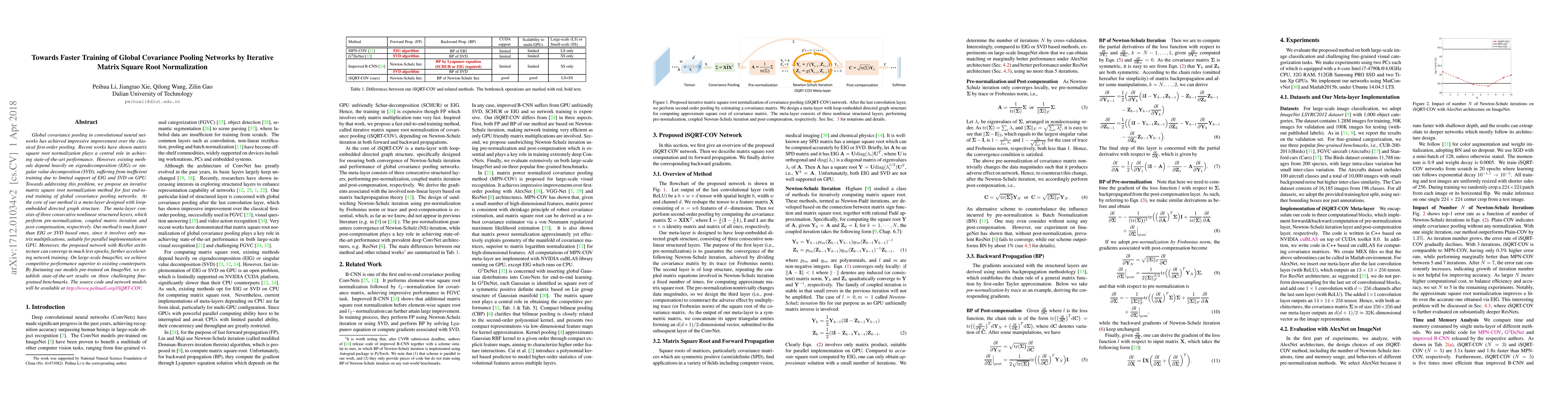 This paper proposes an iterative matrix square root normalization method to accelerate the training of global covariance pooling networks, which significantly outperforms classical first-order pooling. The method employs a meta-layer with a loop-embedded directed graph structure, enabling faster training through efficient GPU-based matrix multiplications, leading to competitive performance on ImageNet and state-of-the-art results on fine-grained benchmarks.