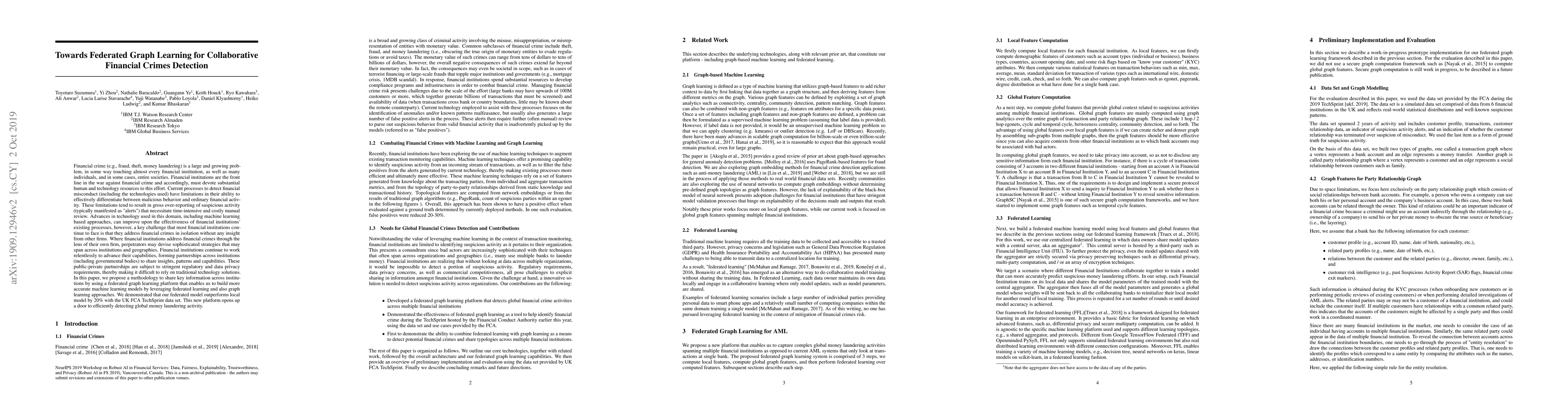 Financial crime is a large and growing problem, in some way touching almost every financial institution. Financial institutions are the front line in the war against financial crime and accordingly, must devote substantial human and technology resources to this effort. Current processes to detect financial misconduct have limitations in their ability to effectively differentiate between malicious behavior and ordinary financial activity. These limitations tend to result in gross over-reporting of suspicious activity that necessitate time-intensive and costly manual review. Advances in technology used in this domain, including machine learning based approaches, can improve upon the effectiveness of financial institutions' existing processes, however, a key challenge that most financial institutions continue to face is that they address financial crimes in isolation without any insight from other firms. Where financial institutions address financial crimes through the lens of their own firm, perpetrators may devise sophisticated strategies that may span across institutions and geographies. Financial institutions continue to work relentlessly to advance their capabilities, forming partnerships across institutions to share insights, patterns and capabilities. These public-private partnerships are subject to stringent regulatory and data privacy requirements, thereby making it difficult to rely on traditional technology solutions. In this paper, we propose a methodology to share key information across institutions by using a federated graph learning platform that enables us to build more accurate machine learning models by leveraging federated learning and also graph learning approaches. We demonstrated that our federated model outperforms local model by 20% with the UK FCA TechSprint data set. This new platform opens up a door to efficiently detecting global money laundering activity.