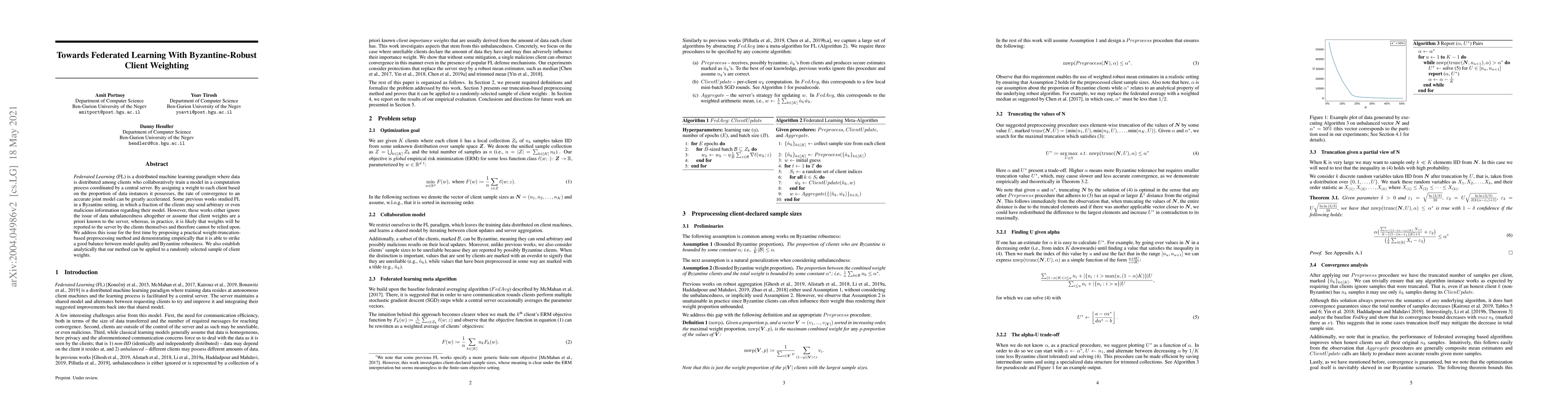 Federated Learning (FL) is a distributed machine learning paradigm where data is distributed among clients who collaboratively train a model in a computation process coordinated by a central server. By assigning a weight to each client based on the proportion of data instances it possesses, the rate of convergence to an accurate joint model can be greatly accelerated. Some previous works studied FL in a Byzantine setting, in which a fraction of the clients may send arbitrary or even malicious information regarding their model. However, these works either ignore the issue of data unbalancedness altogether or assume that client weights are apriori known to the server, whereas, in practice, it is likely that weights will be reported to the server by the clients themselves and therefore cannot be relied upon. We address this issue for the first time by proposing a practical weight-truncation-based preprocessing method and demonstrating empirically that it is able to strike a good balance between model quality and Byzantine robustness. We also establish analytically that our method can be applied to a randomly selected sample of client weights.