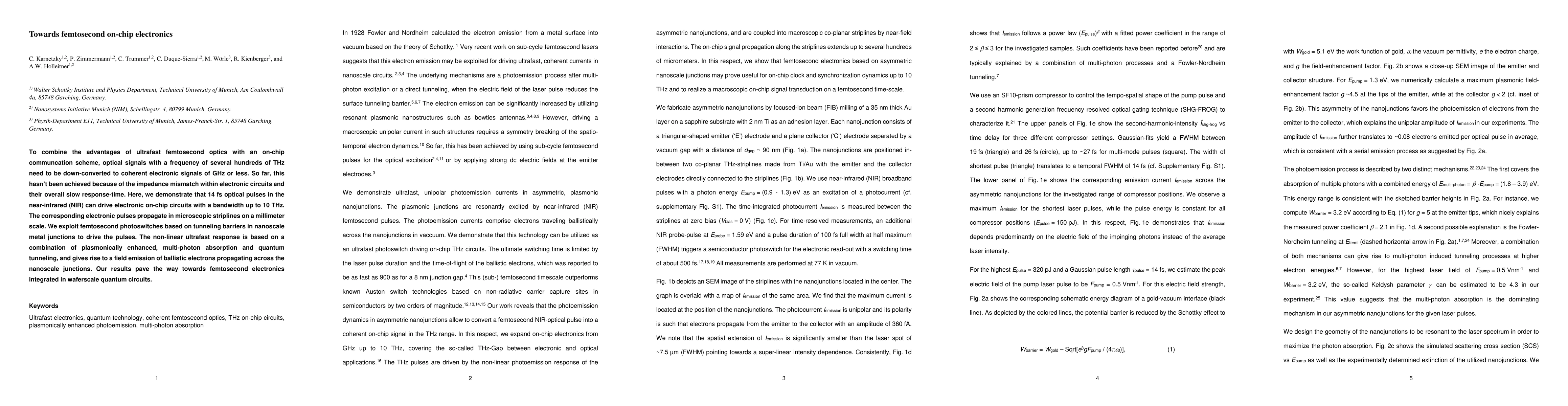 To combine the advantages of ultrafast femtosecond optics with an on-chip communcation scheme, optical signals with a frequency of several hundreds of THz need to be down-converted to coherent electronic signals of GHz or less. So far, this has not been achieved because of the impedance mismatch within electronic circuits and their overall slow response-time. Here, we demonstrate that 14 fs optical pulses in the near-infrared (NIR) can drive electronic on-chip circuits with a bandwidth up to 10 THz. The corresponding electronic pulses propagate in microscopic striplines on a millimeter scale. We exploit femtosecond photoswitches based on tunneling barriers in nanoscale metal junctions to drive the pulses. The non-linear ultrafast response is based on a combination of plasmonically enhanced, multi-photon absorption and quantum tunneling, and gives rise to a field emission of ballistic electrons propagating across the nanoscale junctions. Our results pave the way towards femtosecond electronics integrated in waferscale quantum circuits.