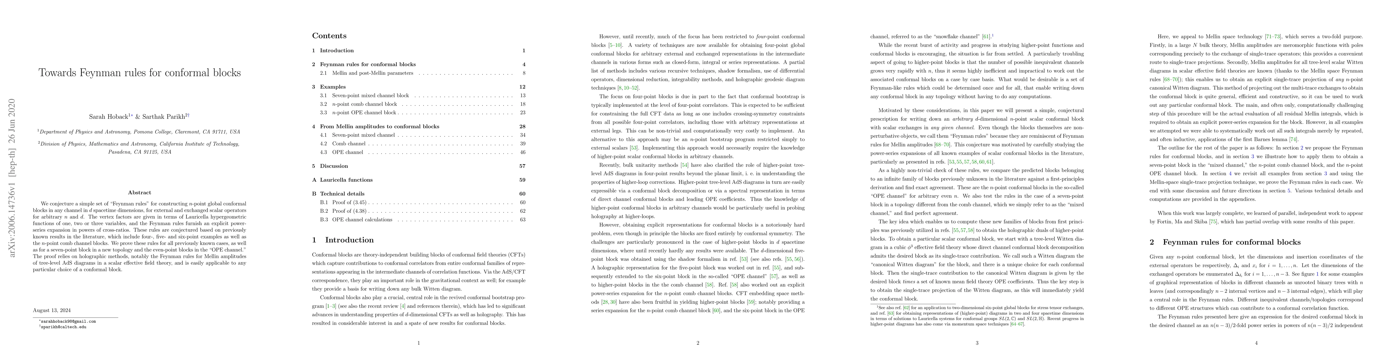 This paper proposes a set of Feynman rules for constructing $n$-point global conformal blocks in any channel in $d$ dimensions, using Lauricella hypergeometric functions. The authors prove these rules for previously known cases and new topologies using holographic methods.