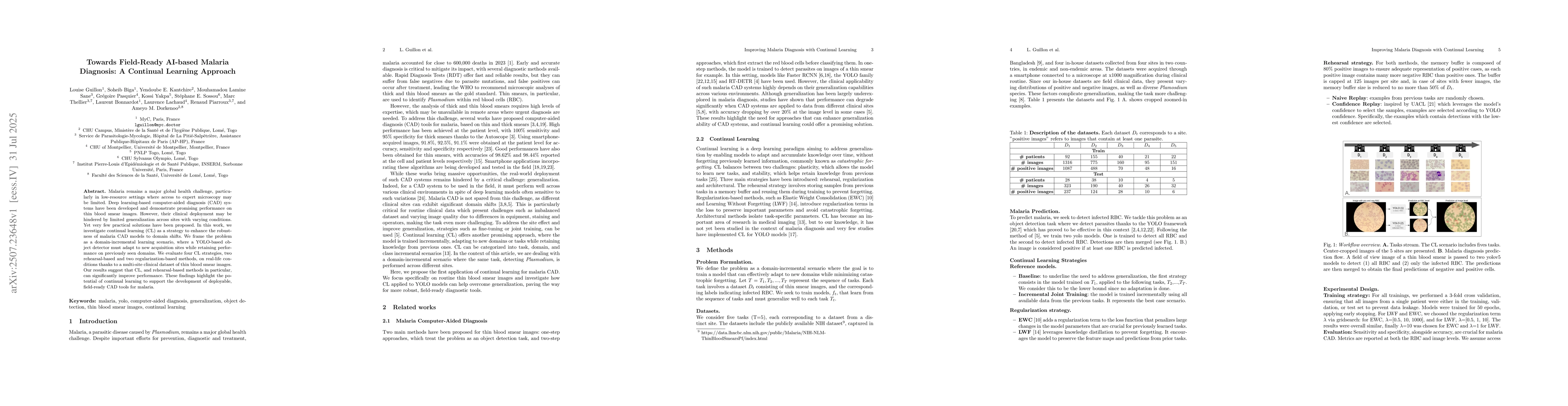 Malaria remains a major global health challenge, particularly in low-resource settings where access to expert microscopy may be limited. Deep learning-based computer-aided diagnosis (CAD) systems have been developed and demonstrate promising performance on thin blood smear images. However, their clinical deployment may be hindered by limited generalization across sites with varying conditions. Yet very few practical solutions have been proposed. In this work, we investigate continual learning (CL) as a strategy to enhance the robustness of malaria CAD models to domain shifts. We frame the problem as a domain-incremental learning scenario, where a YOLO-based object detector must adapt to new acquisition sites while retaining performance on previously seen domains. We evaluate four CL strategies, two rehearsal-based and two regularization-based methods, on real-life conditions thanks to a multi-site clinical dataset of thin blood smear images. Our results suggest that CL, and rehearsal-based methods in particular, can significantly improve performance. These findings highlight the potential of continual learning to support the development of deployable, field-ready CAD tools for malaria.