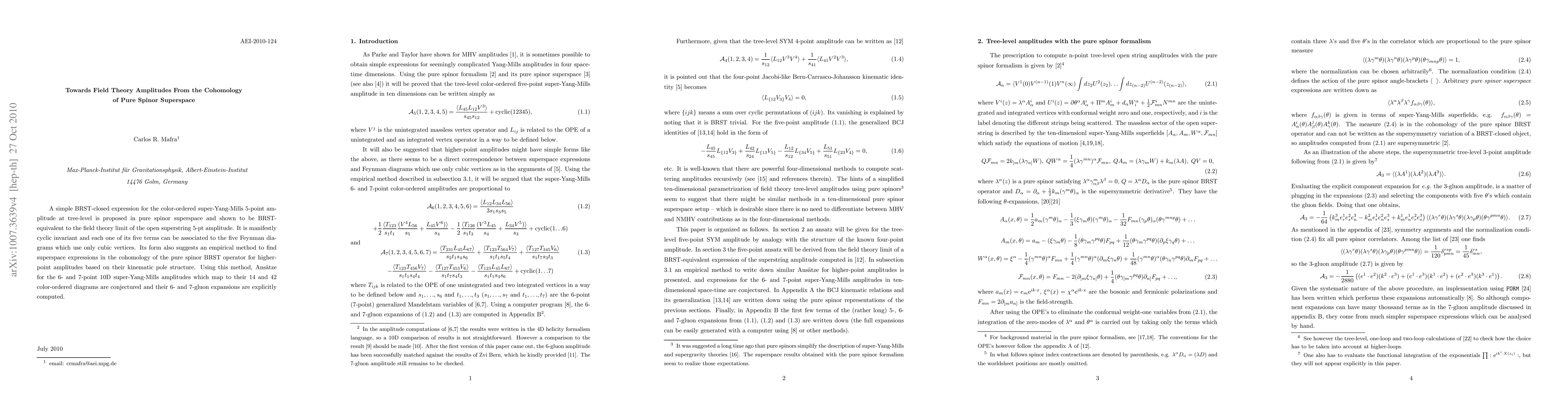 A simple BRST-closed expression for the color-ordered super-Yang-Mills 5-point amplitude at tree-level is proposed in pure spinor superspace and shown to be BRST-equivalent to the field theory limit of the open superstring 5-pt amplitude. It is manifestly cyclic invariant and each one of its five terms can be associated to the five Feynman diagrams which use only cubic vertices. Its form also suggests an empirical method to find superspace expressions in the cohomology of the pure spinor BRST operator for higher-point amplitudes based on their kinematic pole structure. Using this method, Ansaetze for the 6- and 7-point 10D super-Yang-Mills amplitudes which map to their 14 and 42 color-ordered diagrams are conjectured and their 6- and 7-gluon expansions are explicitly computed.