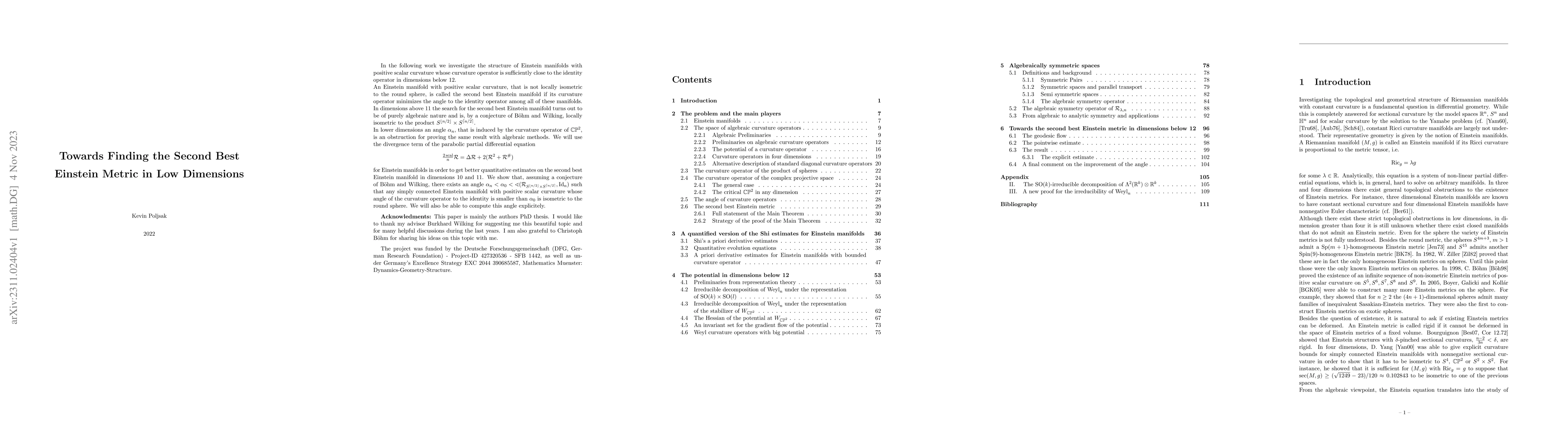 This paper explores the structure of Einstein manifolds with positive scalar curvature in dimensions below 12, focusing on identifying the second best Einstein manifold. It demonstrates that under a conjecture, any such manifold with a curvature operator angle slightly smaller than a certain threshold is isometric to the round sphere.